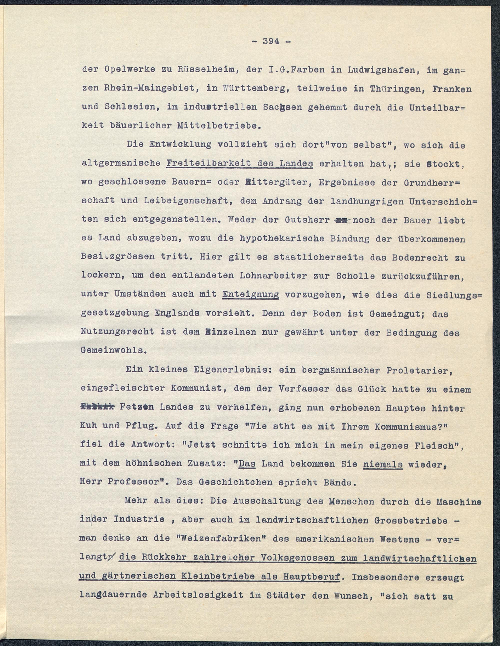 Mehr als dies: Die Ausschaltung des Menschen durch die Maschineinder Industrie , aber auch im landwirtschaftlichen Grossbetriebe -man denke an die "Weizenfabriken" des amerikanischen Westens - ver=langte die Rückkehr zahlreicher Volksgenossen zum landwirtschaftlichenund gärtnerischen Kleinbetriebe als Hauptberuf . Insbesondere erzeugtlangdauernde Arbeitslosigkeit im Städter den Wunsch, "sich satt zu