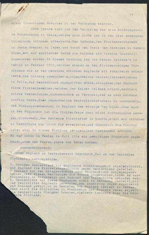 2. Nachdem Deutschland das englische Bündnisangebot abgelahnthatte,hat England die Einkreisungspolitik gegen Deutschland geleitet.5.England hat dem Kriegsausbruch zwar diplomatisch entgegengear-beitet,aber diesen Bemühungen die Spitze abgebrochen,indem es ver-tragsmäßig an Frankreich und Rußland zur Waffenhilfe gebunden war.4. Deutschland hat diese Bindungen nicht in Rechnun,_ gestellt,mitder Neutralität Englands gerechnet,den Landkrieg gegen Frankreich und Rußland gewagt,um im Seekrieg von England besiegt zu --'erden.