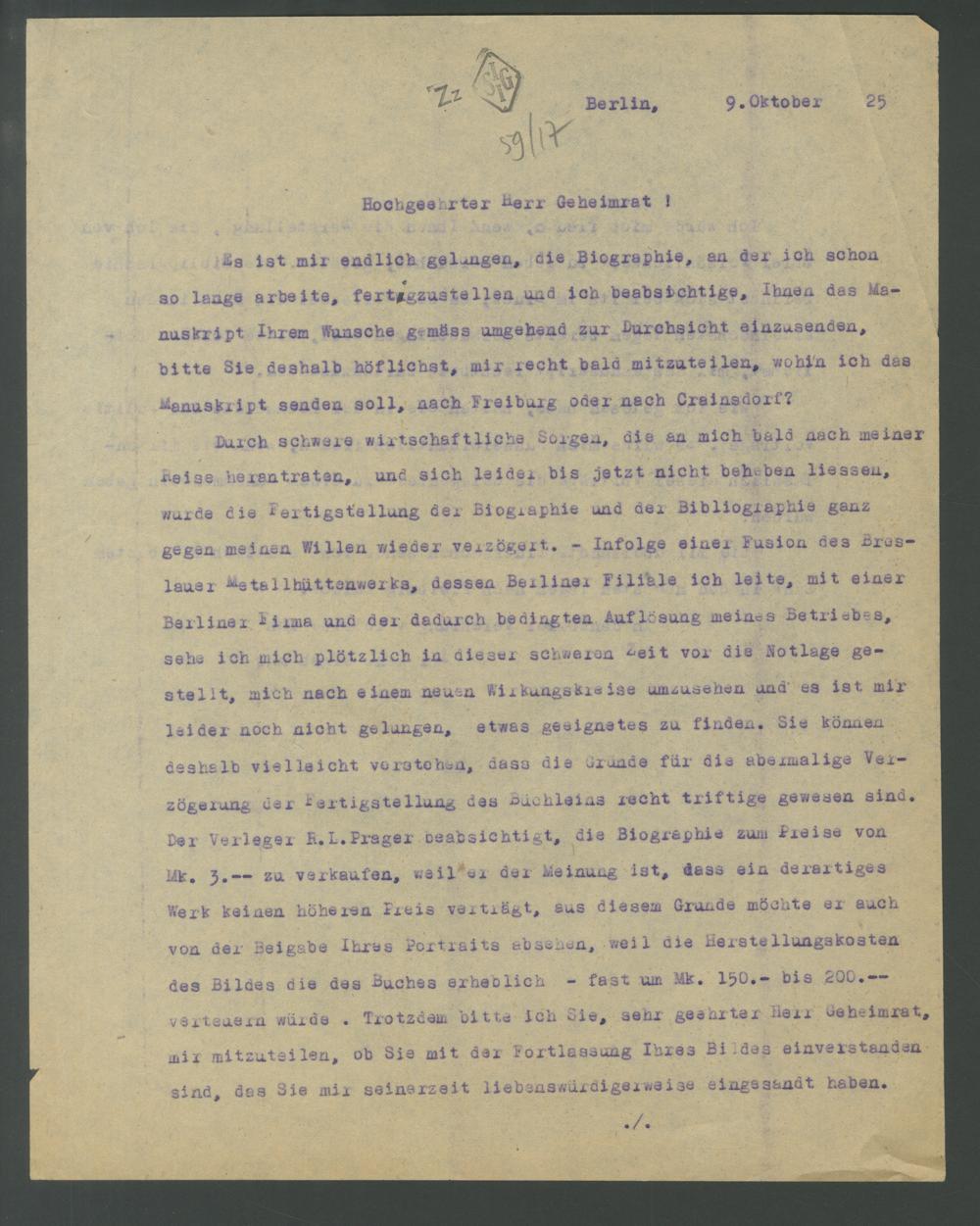 Der Verleger R.L. Prager beabsichtigt, die Biographie zum Preise von