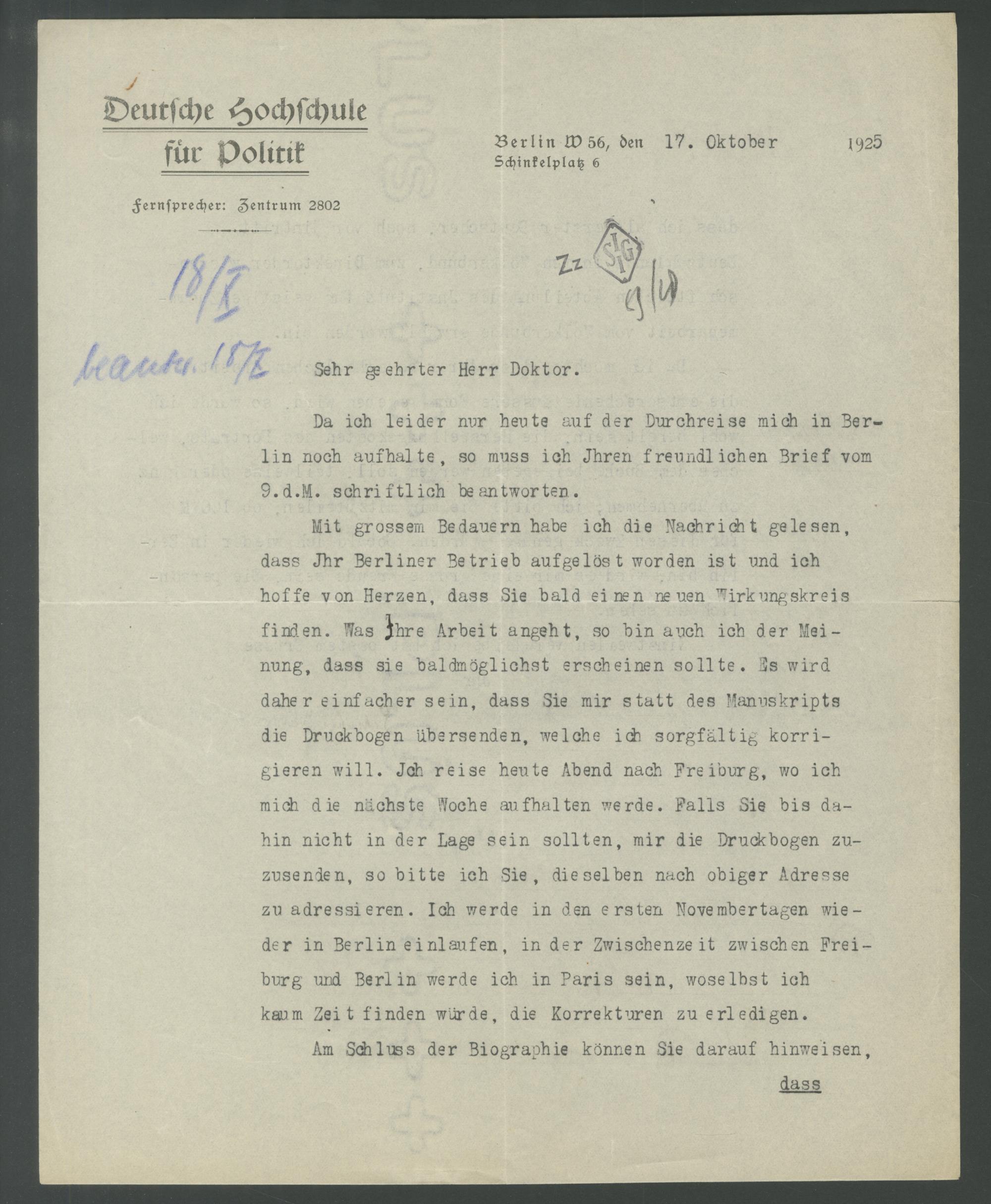 für Politik Berlin W 56, den 17. Oktober 1925