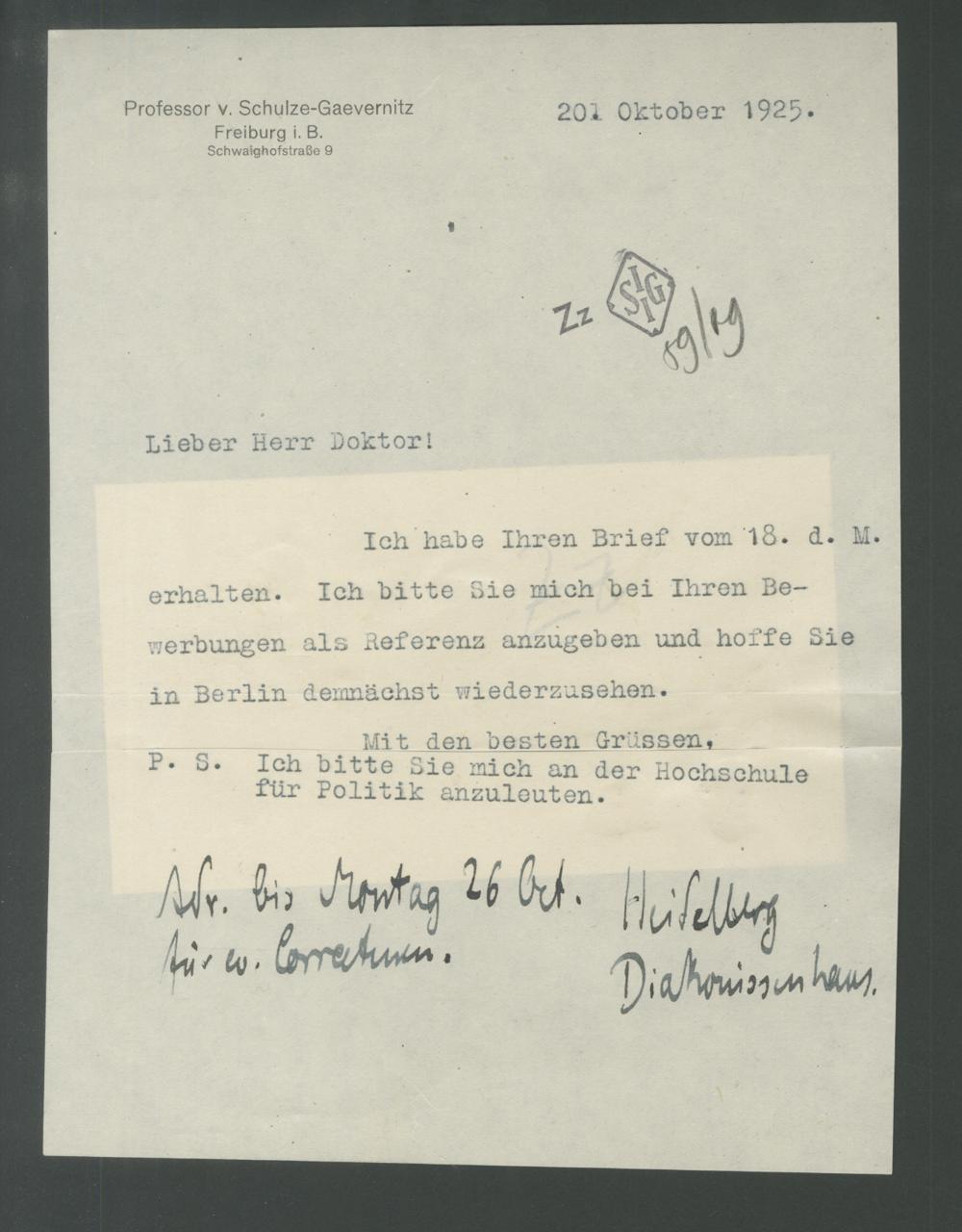 Professor v. Schulze-Gaevernitz 20. Oktober 1925.