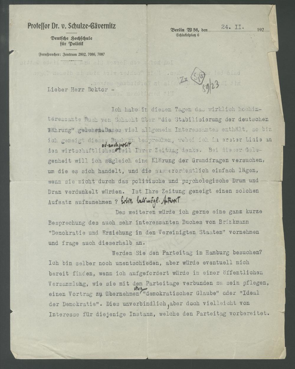 Professor Dr. v. Schulze-Gävernitz Berlin W 56, den 24. II. 192[7?]