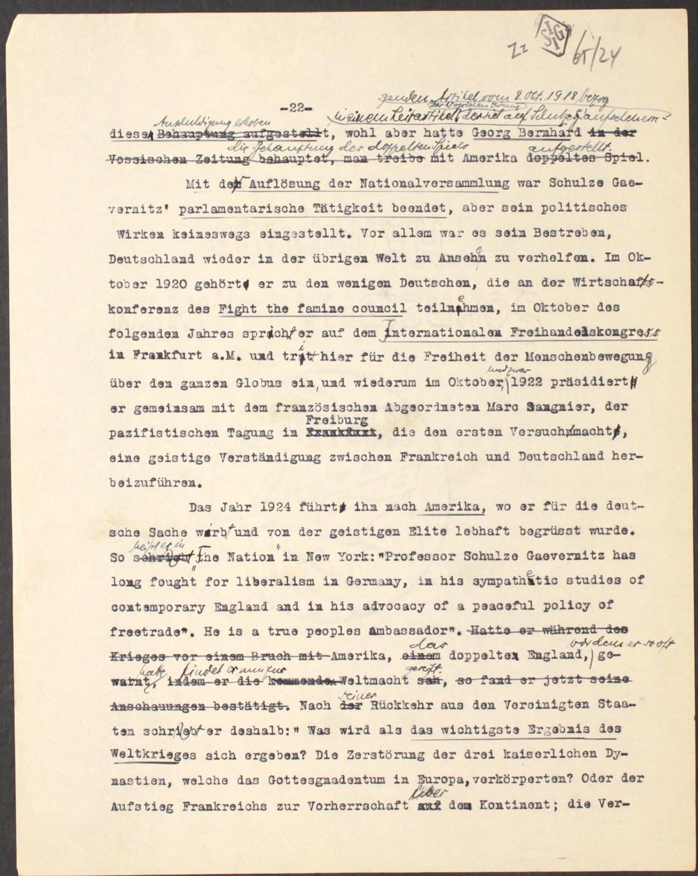 Mit de ^Auflösung dar Na tionalve rsammlun g war Schulze Gae-vernitz' parlamentarische Tätigkeit beendet, aber sein politischesWirke* keineswegs eingestellt. Vor allem war es sein Bestreben,Deutschland wieder in der übrige* Welt zu Ansehn zu verhelfe*. Im Ok-tober 1920 gehört# er zu den wenigen Deutschen , die an der Wirtscha#^-