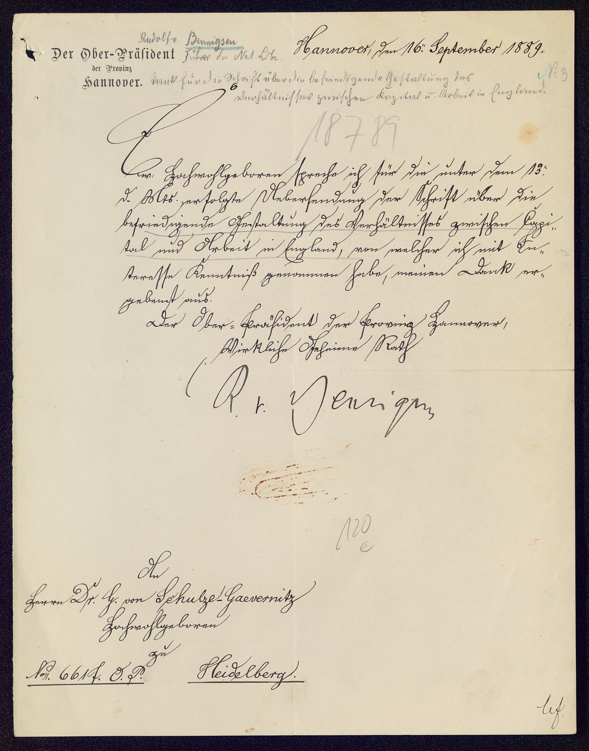 Rudolf v. BennigsenHannover , den 16. September 1889.Der Ober- Präsident Fehler Er Mal. Lohn.der ProvinzNo 3Hannover. Dank für die Schaft aber die befriedigende Gestaltung desVerhältnisses zwischen Kapital um. Arbeit in England-1878. Hochwohlgeboren spreche ich für die unter dem 18:d. Als. erfolgte Ueberhendung der Schrift aber diebefriedigende Gestaltung des Verhältnisses zwischen Papi-statt und Arbeit in England , von welcher ich mit In-steresse Kenntnis genommen habe, meinen Dank er-gebenst aus.Der Ober-Präsident der Provinz Hannover ,Wirkliche Geheime RathUhr. langederHerrn Der. H. von Schulze- GaeveritzHochwohlgeborenzuHeidelberg .So. 6617. 8. B.