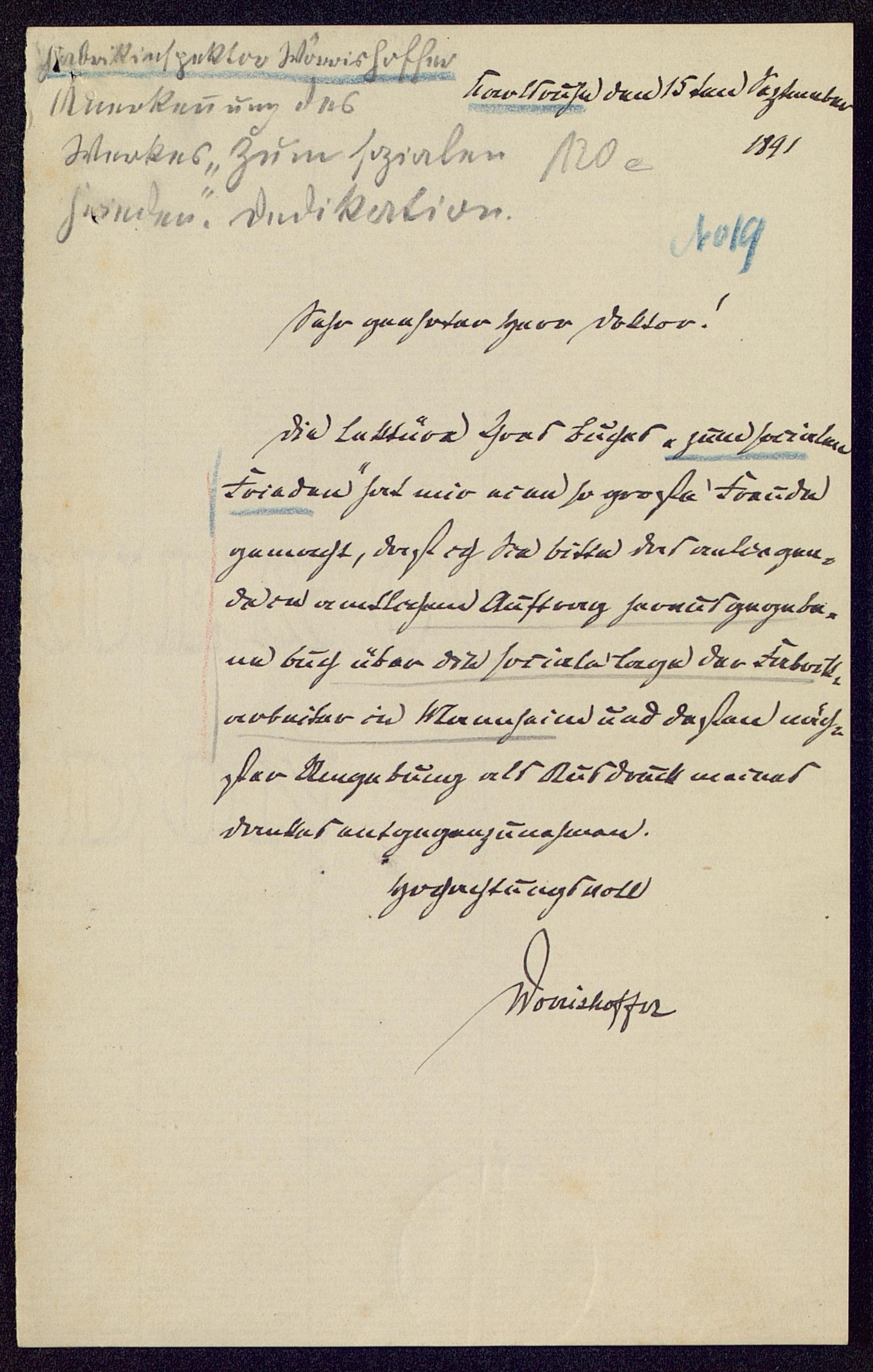 die Lektüre Goes Buches« zund spiralenFrieden» hat mir eine so große Freundegemacht, derß ich Sie bitte das anliegen-de en or metlichend Auftrag havausgegebe-un buch über die sociale lage der Fuboittarbeiter in Mannsein und daglan nächezer Umgebung als Ausdruck meinesdantes entgegenzunehmen.