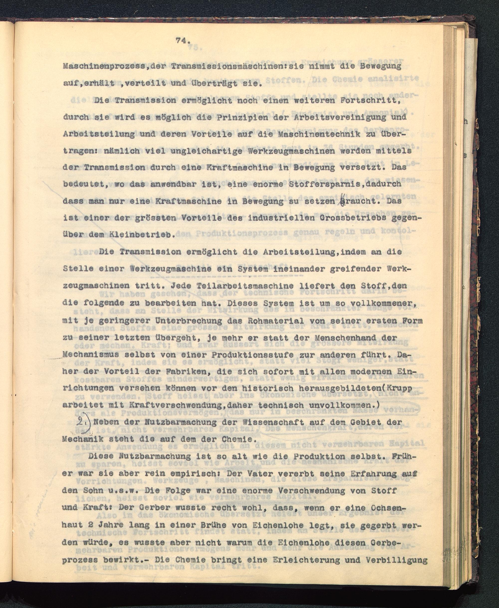 Die Transmission ermöglicht die Arbeitsteilung,indem an dieStelle einer Werkzeugmaschine ein System ineinander greifender Werk-zeugmaschinen tritt. Jede Teilarbeitamaschine liefert den Stoff,dendie folgende zu bearbeiten hat. Dieses System ist um so vollkommener,mit je geringerer Unterbrechung das Rohmaterial von seiner ersten Formzu seiner letzten übergeht, je mehr er statt der Menschenhand derMechanismus selbst von einer Produktionsstufe zur anderen führt. Da-her der Vorteil der Fabriken, die sich sofort mit allen modernen Ein-richtungen versehen können vor den historisch herausgebildeten(Krupparbeitet mit Kraftverachwendung,daher technisch unvollkommen.)