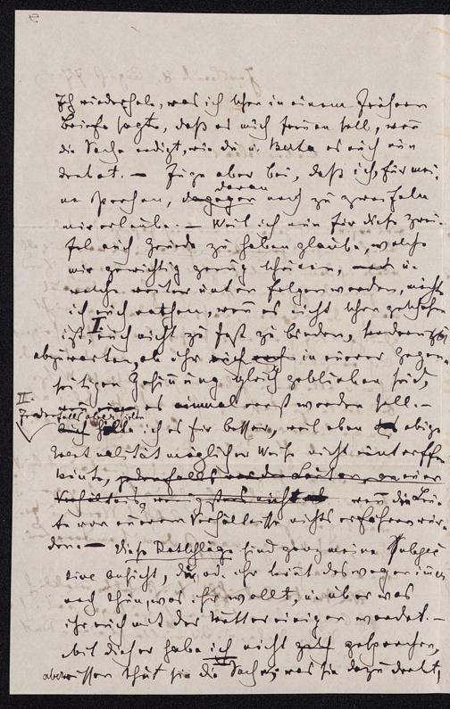 Ich wiederhole, was ich schon in einem frühernBriefe sagte, daß es mich freuen soll, wenndie Sache endigt, wie Du u. Berta es euch nundrehet. – Füge aber bei, daß ich, für mei-daranne Person, dagegen noch zu zweifelnmir erlaube. – Weil ich nun für diese Zwei-fel auch Gründe zu haben glaube, welchemir gewichtig genug scheinen, nach u.welche weiter unten folgen werden, möchteich auch rathen, wenn es nicht schon geschehenist, I. euch nicht zu fest zu binden, sondernabzuwarten, ob ihr euch auch in euerer Gegen-seitigen Gesinnung gleich geblieben seid,II.wenn einen es einmal recht werden soll . -Jedenfalls aberhielteauch Fälle ich es für besser, weil eben das obigeEventualität möglicher Weise nicht eintreffenkönnte, jedenfalls vor den Leuten, da euerVerhältnis wenigstens nicht ab, wenn die Leu-te vor euerem Verhältnisse nichts erfahren wür-den.— Diese Ratschläge sind ganz meine subjec-tive Ansicht, Du od. ihr könnt deswegen immernoch thun, was ihr wollt, u. über wasihr euch mit der Mutter einigen werdet.Mit dieser habe ich nicht zalt gesprochen, aber wissen thut sie die Sache; was sie dazu denkt,