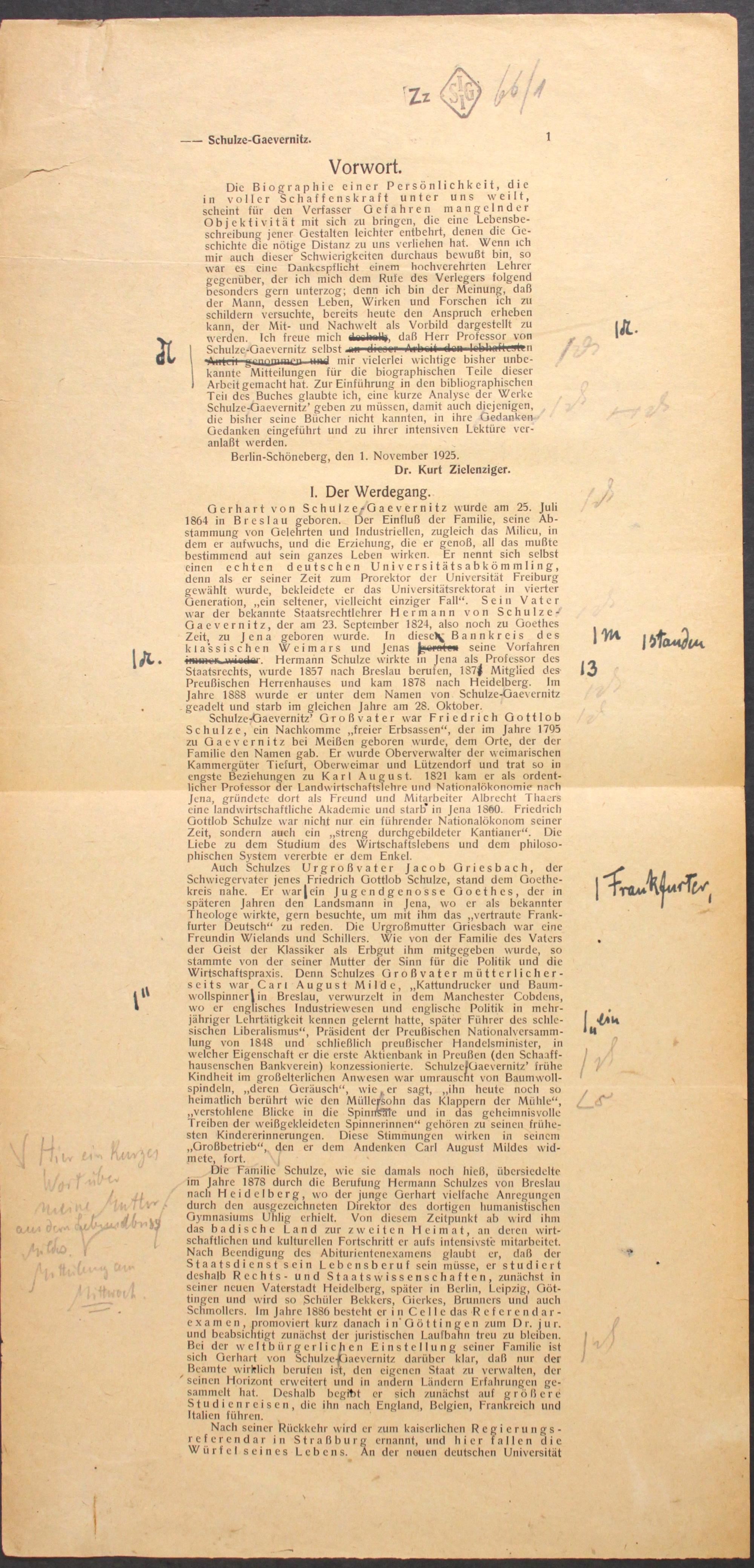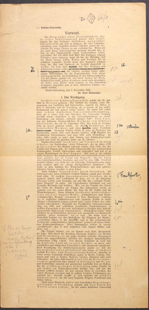 [Druckprobe und mschr. Entwurf der Bio-Bibliographie Schulze-Gävernitz']
