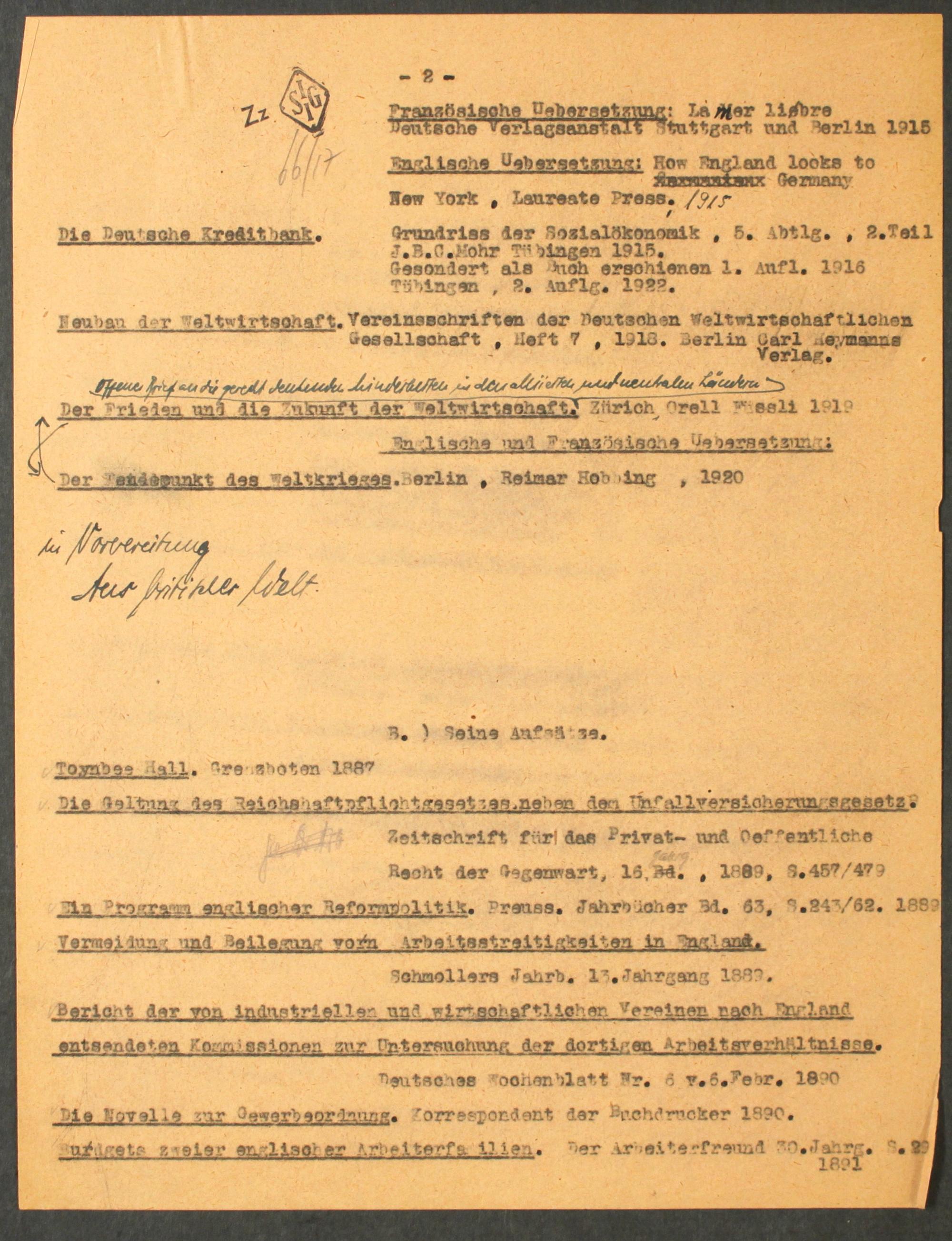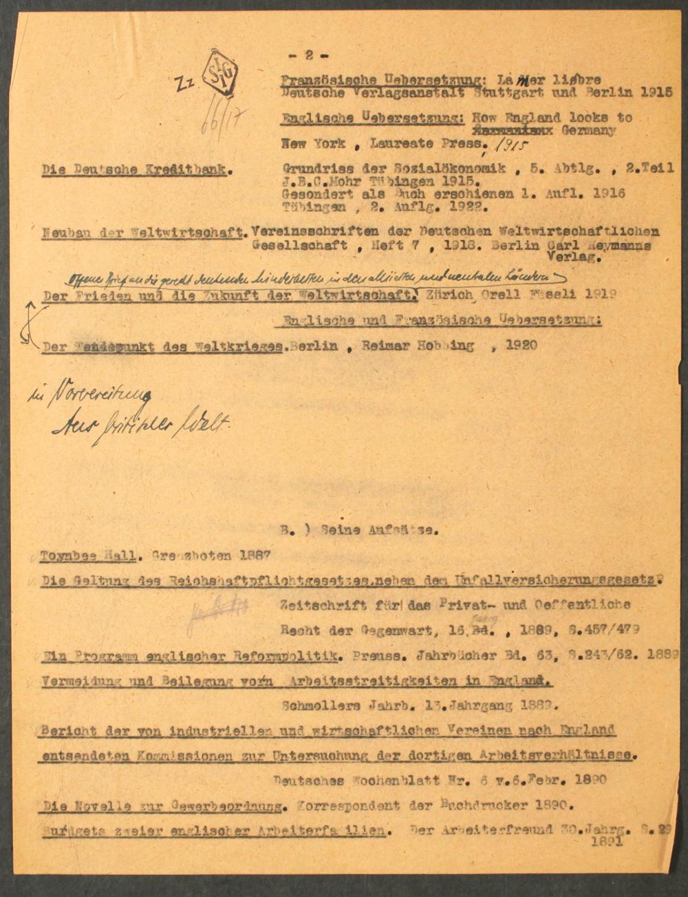 [Druckprobe und mschr. Entwurf der Bio-Bibliographie Schulze-Gävernitz']