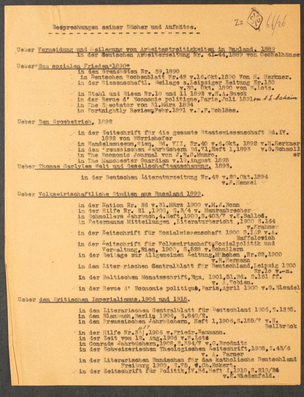 [Druckprobe und mschr. Entwurf der Bio-Bibliographie Schulze-Gävernitz']