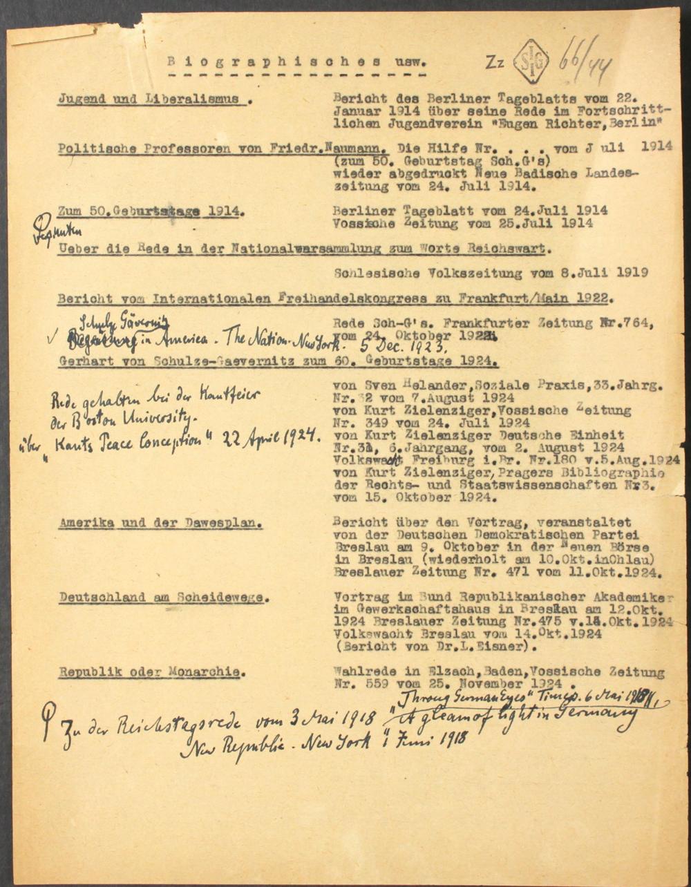 [Druckprobe und mschr. Entwurf der Bio-Bibliographie Schulze-Gävernitz']