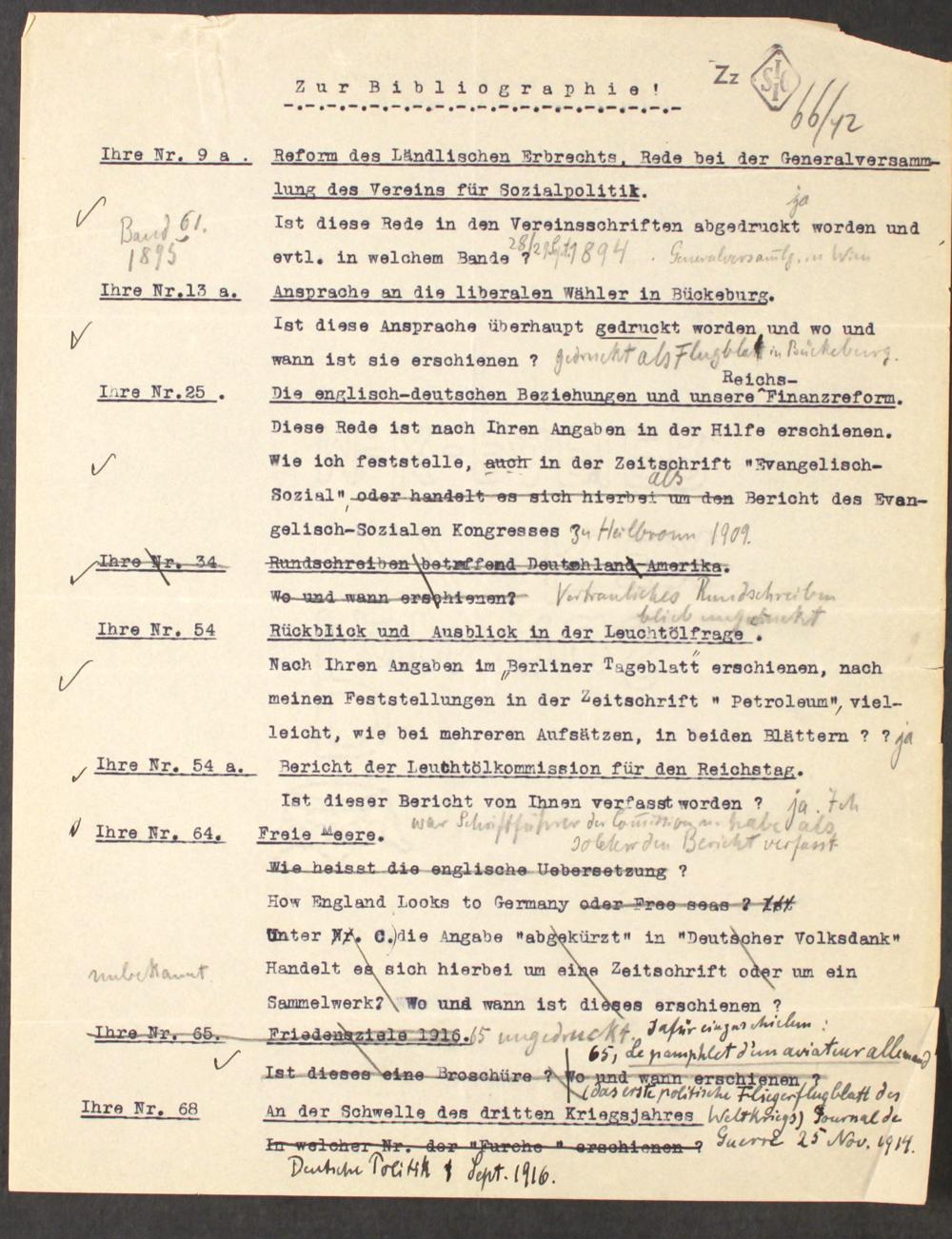 [Druckprobe und mschr. Entwurf der Bio-Bibliographie Schulze-Gävernitz']