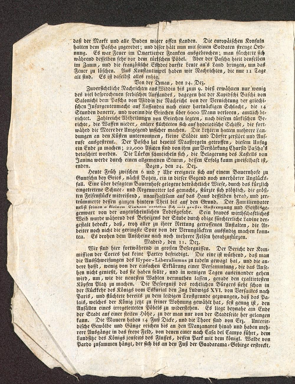 Zuverſichtliche Nachrichten aus Widdin bis zum 9. dieß erwaͤhnen nur wenigdes viel besprochenen ſerbischen Aufſtandes, dagegen hat der Kapidſchi Baſchi vonSalonichi dem Pascha von Widdin die Nachricht von der Vernichtung der griechi-schen Inſurgentenmacht auf Kaſſandra nach einer hartnaͤckigen Schlacht die 14Stunden dauerte, und worinn die Griechen uͤber 6000 Mann verloren, amtlich be-richtet. Zahlreiche Abtheilungen von Griechen legten, nach diesem tuͤrkischen Be-richte, die Waffen nieder, andere fluͤchteten sich auf hydriotische Schiffe, die fort-waͤhrd die Meere der Umgegend unſicher machen. Die Letztern hatten mehrere Lan-dungen an den Kuͤſten unternomnen, kleine Staͤdte und Doͤrfer zerſtoͤrt und Auf-rufe ausgestreut. Der Pascha hat bereits Maaßregeln getroffen, diesem Unfugein Ende zu machen; 22,000 Asiaten ſind von ihm zur Verstaͤrkung Churſid Paſcha'sdetaſchirt worden. Die Tuͤrken schmeicheln sich, die Belagerung des Kastells vonJanina werde durch einen allgemeinen Sturm, dessen Erfolg kaum zweifelhaft iſt,enden. Bozen, den 24 Dez.