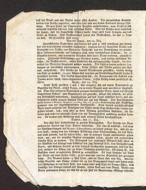 daß der Markt und alle Buden wieder offen standen. Die europaͤischen Konsulnhatten dem Paſcha zugeredet; und diſer haͤlt nun mit ſeinen Soldaten ſtrenge Ord-nung. Es war Feuer im Quartiewer Franken ausgebrochen; man fuͤrchtete ſichwaͤhrend deſſelben ſehr vor dem tuͤrkſchen Poͤbel. Aber der Paſcha hielt denſelbenim Zaum, und die franzoͤſiſche Faͤhre durfte Leute an's Land bringen um dasFeuer zu loͤſchen. Aus Konſtantinopel haben wir Nachrichten, die nur 11 Tagealt ſind. Es iſt daſelbſt alles ruhig.