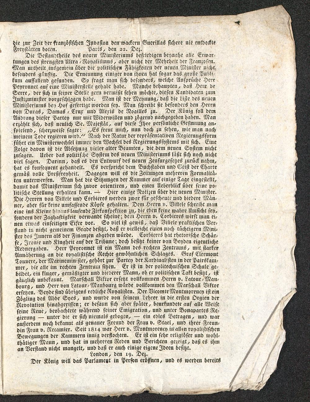 Die Beſtandtheile des neuen Miniſteriums befriedigen beynahe alle Erwar-tungen des ſtrengſten Ultra⸗Royalismus, aber nicht der Mehrheit der Franzoſen.Man urtheilt insgemein uͤber die politiſchen Faͤhigkeiten der neuen Miniſter nichtbeſonders guͤnſtig. Die Ernennung einiger von ihnen hat ſogar das große Publi-kum auffallend gefunden. So fragt man ſich beſfonders, welche Anſpruͤche HerrPeyronnet auf eine Miniſterſtelle gehabt habe. Manche behaupten, daß Herr deSerre, der ſich in ſeiner Stelle gern vermißt ſehen moͤchte, dieſen Kandidaten zumJuſtizminiſter vorgeſchlagen habe. Man iſt der Meynung, daß die Liſte des neuenMiniſteriums bey Hof gefertigt worden ſey. Man ſchreibt ſie beſonders den Herrnvon Duras, Damas⸗Crux und Alexis de Noailles zu. Der Koͤnig ſoll demAndrang dieſer Partey nur mit Widerwillen und zoͤgernd nachgegeben haben. Manerzaͤhlt ſich, daß neulich Se. Majeſtaͤt, auf dieſe Ihre perſoͤnliche Geſinnung an-ſpielend, ſcherzweiſe ſagte: „Es freut mich, nun doch zu ſehen, wie man nachmeinem Tode regieren wird.“ Nach der Natur der repraͤſentativen Regierungsformfuͤhrt ein Miniſterwechſel immer den Wechſel des Regierungsſyſtems mit ſich. EineFolge davon iſt die Abſetzung vieler alter Beamten, die dem neuen Syſtem nichtzuſagen. Ueber das politiſche Syſtem des neuen Miniſteriums laͤßt ſich noch nichtviel ſagen. Darinn, daß es den Entwurf des neuen Zenſurgeſetzes zuruͤck nahm,hat es konſequent gehandelt. Es verſpricht dem Buchſtaben und Geiſt der Chartegemaͤß volle Preßfreyheit. Dagegen will es die Zeitungen mehreren Formalitaͤ-ten unterwerfen. Man hat die Sitzungen der Kammer auf einige Tage eingeſtellt,damit das Miniſterium ſich zuvor orientiren, und einen Ueberblick uͤber ſeine po-litiſche Stellung erhalten kann.— Hier einige Notizen uͤber die neuen Miniſter.Die Herren von Villele und Corbieres werden zwar fuͤr geſcheute und biedere Maͤn-ner, aber fuͤr keine umfaſſende Koͤpfe gehalten. Dem Heern v. Villele ſchreibt maneine ins Kleine hinaus laufende Zirkonſpektion zu, die eben keine wahre Umſicht ſey,ſondern der Zaghaftigkeit verwandt ſcheine; den Herrn v. Corbieres wirft man ei-nen etwas einfeitigen Eifer vor. So viel iſt gewiß, daß Villele praktiſchen Ver-ſtand in nicht gemeinem Grade beſitzt, daß er vielleicht einen noch tuͤchtigern Mini-ſter des Innern als der Finanzen abgeben wuͤrde. Corbieres hat rhetoriſche Schaͤr-fe, Ironie und Klugheit auf der Tribune; doch beſitzt keiner von Beyden eigentlicheRednergaben. Herr Peyronnet iſt ein Mann des rechten Zentrums, mit ſtarkerAnnaͤherung an die royaliſtiſche Rechte gewoͤhnlichen Schlages. Graf ClermontTonnere, der Marineminiſter, gehoͤrt zur Partey der Kardinaliſten in der Pairskam-mer, die alle im rechten Zentrum ſitzen. Er iſt in der politechniſchen Schule ge-bildet, ein kluger, gemaͤßigter und biederer Mann, ob er politiſchen Takt beſitzt, iſtgaͤnzlich unbekannt. Marſchall Viktor erſetzt vollkommen Herrn v. Latour-Mau-bourg, und Herr von Latour⸗Maubourg wuͤrde vollkommen den Marſchall Viktorerſetzen. Beyde ſind uͤbrigens redliche Royaliſten. Der Vicomte Montmorency iſt einZoͤgling des Abbe Syes, und wurde von ſeinem Lehrer in die erſten Orgien derRevolution hinabgeriſſen; er beſann ſich aber ſpaͤter, beurkundete auf alle Weiſefeine Reue, beobachtete waͤhrend ſeiner Emigration, und unter Bonapartes Re-gierung— unter die er ſich niemals gebogen,— ein edles Betragen, und waraußerdem noch bekannt als genauer Freund der Frau v. Stael, und ihrer Freun-din Frau v. Recamier. Seit 1814 war Herr v. Montmorency in allen royaliſtiſchenBewegungen der Kammern innig verflochten. Er iſt ein ſehr religioͤſer und wohl-thaͤtiger Mann, und hat in mehreren Reden und Berichten gezeigt, daß es ihman Verſtand nicht mangelt, und daß er auch einige eigene Ideen beſitzt,