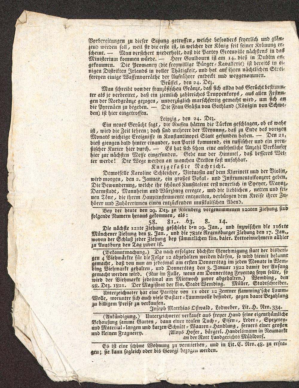 Die naͤchſte 121te Ziehung geſchieht den 29. Jan., und inzwiſchen die 1161te Muͤnchener Ziehung den 8. Jan. und die 782te Regensburger Ziehung den 17. Jan. wovon der Schluß jeder Ziehung bey ſaͤmmtlichen koͤn. baier. Lottoeinnehmern allhier zu Augsburg den Tag zuvor iſt.