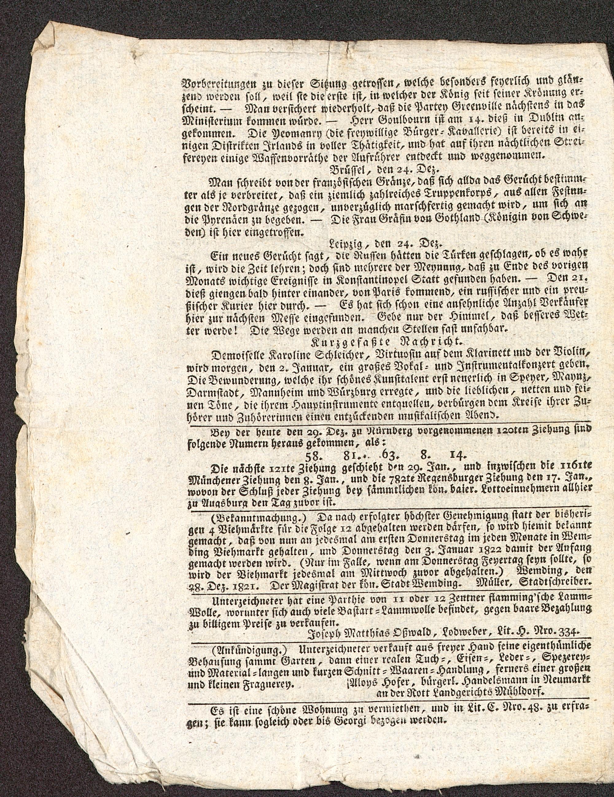 (Bekanntmachung.) Da nach erfolgter hoͤchſter Genehmigung ſtatt der bisheri- gen 4 Viehmaͤrkte fuͤr die Folge 12 abgehalten werden daͤrfen, ſo wird hiemit bekannt gemacht, daß von nun an jedesmal am erſten Donnerstag im jeden Monate in Wem- ding Viehmarkt gehalten, und Donnerstag den 3. Januar 1822 damit der Anfang gemacht werden wird.(Nur im Falle, wenn am Donnerstag Feyertag ſeyn ſollte, ſo wird der Viehmarkt jedesmal am Mittwoch zuvor abgehalten.) Wemding, den 28. Dez. 1821. Der Magiſtrat der koͤn. Stadt Wemding. Muͤller, Stadtſchreiber.