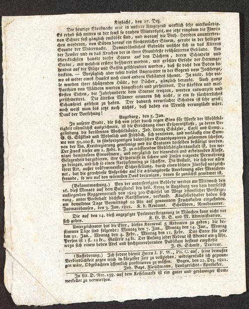 Kitzbichl, den 27. Dez.Die heurige Cbristnacht war in unserer Umgegend wirklich sehr merkwürdig,es erhob sich mitten in der sonst so rauhen Winterszeit, wo jetzt ringsum die Flureuvon Schnee fast gänzlich entblößt sind, und worauf die Vieh-Hecrden ununterbro-chen weydeten, von Süden herauf ein fürchterlicher Sturm, gerade in der heiligenStunde der Mitternacht. Donnerähnliches Gebrülle mischte sich in das Klirrender Fenster und in das Krachen der in ihrer Grundfeste erschütterten Gebäude. Amschrecklichsten hauste dieser Sturm auf den Dächern , deren Schindeln undSteine, mit welchen erstere beschwert werden, mit größter Gefahr der Herumge-henden auf die Platze und Gassen geschleudert wurden, daß sie dicht den Boden be-deckten. — Vorzüglich aber tobte dieses Ungewitter in der Gegend vom Jochberge,wo es weder eines Hauses noch eines andern Gebäudes schonte. Ja viele, sehr vie-le wurden ihrer schützenden Hülle, der Dächer, gänzlich beraubt. Auch ganzeParthien von Wäldern wurden hingestreckt und zersplittert. Die stärksten und mas-^vsten Eichen, die Jahrhunderte dem Sturme trvtzten, wurden entwurzelt undzerschmettert. Die ältesten Manner erinnern sich nicht, je ein so fürchterlichesSchanspiel gesehen zu haben. Der dadurch verursachte Schaden ist sehr groß;«och weiß man bis jetzt noch nichts, daß dabey ein Mensch verunglückt wäre.Dank der Vorsehung!