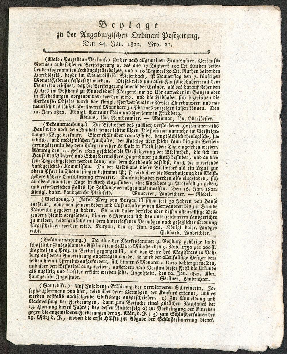 zu der Augsburgischen Ordinari Postzeitung.Den 24. Jan. 1822. Nro. 21.