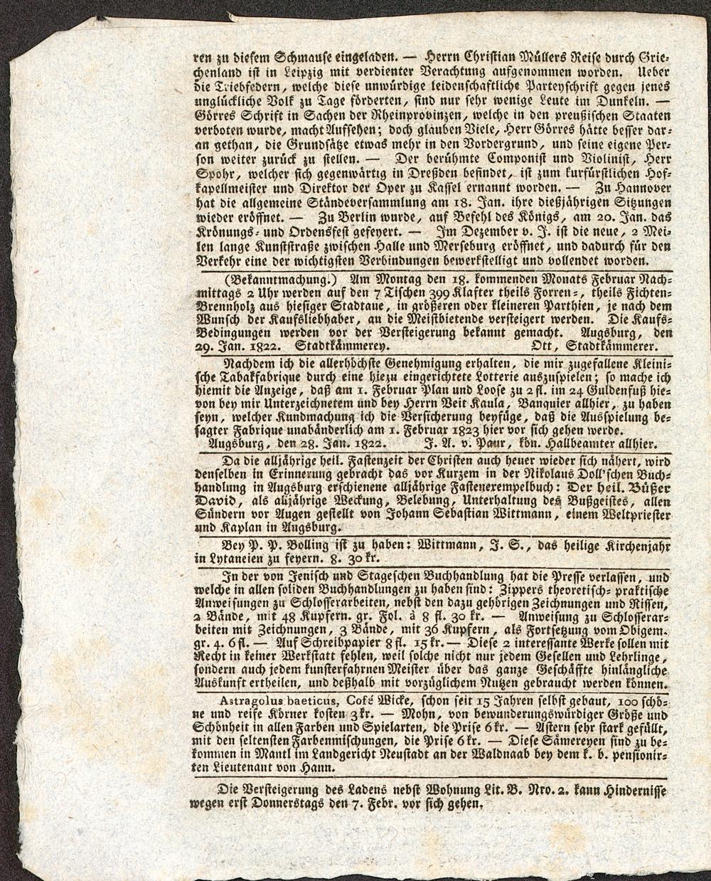 Nachdem ich die allerhöchste Genehmigung erhalten, die mir zugefallene Kleini-sche Tabakfabrique durch eine hie;u eingerichtete Lotterie auszuspielen; so mache ichhiemit die Anzeige, daß am 1. Februar Plan und Loose zu 2fl. im 24 Guldenfuß hie-von bey mir Unterzeichnetem und bey Herrn Veit Kaula, Banquier allhier, zu habenseyn, welcher Kundmachung ich die Versicherung beyfüge, daß die Ausspielung be-sagter Fabrique unabänderlich am 1. Februar 1823 hier vor sich gehen werde.Augsburg , den 29. Jan. 1922. I. A . v. Pmir, kbn. H allbeamter allhier.Da die alljährige heil. Fastenzeit der Christen auch heuer wieder sich nähert, wirddenselben in Erinnerung gebracht das vor Kurzem in der Nikolaus Doll'schen Buch-handlung in Augsburg erschienene alljahrige Fastenerempelbuch: Der heil. BüßerDavid, als alljährige Weckung, Belebung, Unterhaltung des Bußgeistes, allenSündern vor Augen gestellt von Johann Sebastian Wittmann, einem Weltpriesterund Kaplan in Aug sburg .___