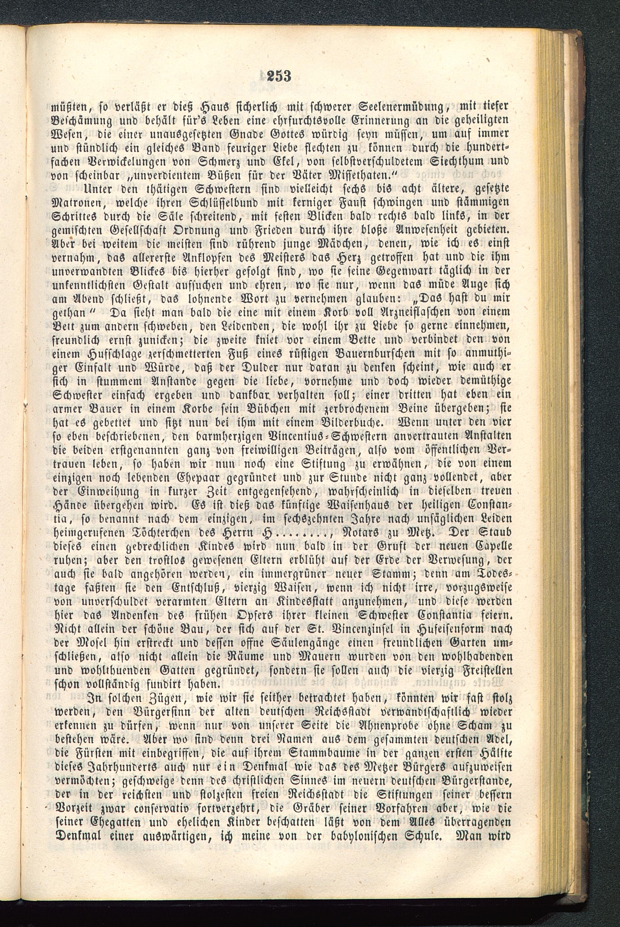 Unter den thätigen Schwestern sind vielleicht sechs bis acht ältere, gesetzteMatronen, welche ihren Schlüsselbund mit kerniger Faust schwingen und stämmigenSchrilles durch die Säle schreilend, mit festen Blicken bald rechts bald links, in dergemischten Gesellschaft Ordnung und Frieden durch ihre bloße Anwesenheit gebieten.Aber bei weitem die meisten sind rührend junge Mädchen, denen, wie ich eS einstvernahm, das allererste Anklopfen des Meisters das Herz getroffen hat und die ihmunverwandten Blickes bis hierher gefolgt sind, wo sie seine Gegenwart täglich in derunkenntlichsten Gestalt aufsuchen und ehren, wo sie nur, wenn daS müde Auge sicham Abend schließt, das lohnende Wort zu vernehmen glauben: „DaS hast du mirgelhan " Da sieht man bald die eine mit einem Korb voll Arzneiflaschen von einemBett zum andern schweben, den Leidenden, die wohl ihr zu Liebe so gerne einnehmen,freundlich ernst zunicken; die zweite kniet vor einem Bette und verbindet den voneinem Hufschlage zerschmetterten Fuß eines rüstigen Bauernburschen mit so anmuthi-ger Einfalt und Würde, daß der Dulder nur daran zu denken scheint, wie auch ersich in stummem Anstand? gegen die liebe, vornehme und doch wieder demüthigeSchwester einfach ergeben und dankbar, verhalten soll; einer dritten hat eben einarmer Bauer in einem Korbe sein Bübchen mit zerbrochenem Beine übergeben; siehat eS gebettet und sitzt nun bei ihm mit einem Bilderbuch«. Wenn unter den vierso eben beschriebenen, den barmherzigen VincentiuS-Schwestern anvertrauten Anstaltendie beiden erstgenannten ganz von freiwilligen Beiträgen, also vom öffentlichen Ver-trauen leben, so haben wir nun noch eine Stiftung zu erwähnen, die von einemeinzigen noch lebenden Ehepaar gegründet und zur Stunde nicht ganz vollendet, aberder Einweihung in kurzer Zeit entgegensehend, wahrscheinlich in dieselben treuenHände übergehen wird. ES ist dieß das künftige Waisenhaus der heiligen Constan-tia, so benannt nach dem einzigen, im sechzehnten Jahre nach unsäglichen Leiden