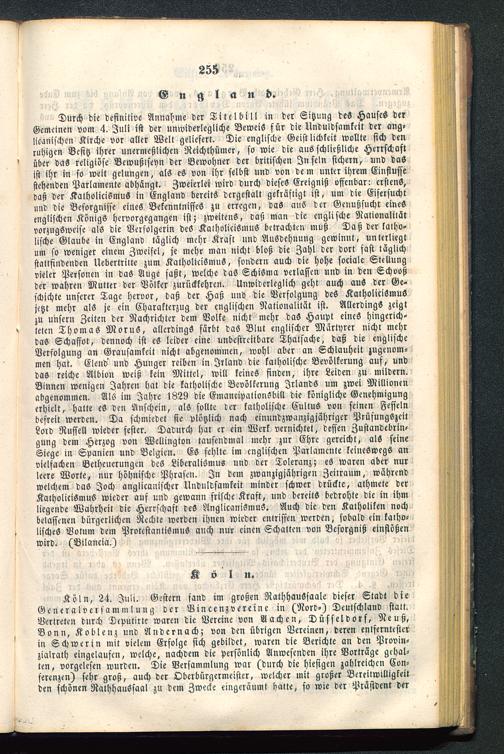 Durch die definitive Annahme der Titel bill in der Sitzung deS Hauses derGemeinen vom 4. Juli ist der umviderlegliche Beweis für die Unduldsamkeil der ang-licanischen Kirche vor aller Welt geliefert. Die englische Geistlichkeit wollte sich denruhigen Besitz ihrer unermeßlichen Reichthümer, so wie die ausschließliche Herrschaftüber daS religiöse Bewußtseyn der Bewohner der britischen Inseln sichern, und dasist ihr in so weit gelungen, als eS von ihr selbst und von dem unter ihrem Einflüssestehenden Parlamente abhängt. Zweierlei wird durch dieses Ereignis, offenbar: erstens,daß der Katholicismus in England bereits dergestalt gekräftigt ist, um die Eifersuchtund die Besorgnisse eines Bekenntnisses zu erregen, daS aus der Genußsucht einesenglischen Königs hervorgegangen ist; zweitens, vaß man die englische Nationalitätvorzugsweise als die Verfolgerin deS Katholicismus betrachten muß Daß der katho-lische Glaube in England täglich mehr Kraft und Ausdehnung gewinnt, unterliegtum so weniger einem Zweifel, je mehr man nicht bloß die Zahl der dort fast täglichstattfindenden Uebertritle zum Katholicismus, sondern auch die hohe sociale Stellungvieler Personen in daS Auge faßt, welche daö Schisma verlassen und in den Schooßder wahren Mutter der Völker zurückkehren. Unwiderleglich geht auch aus der Ge-schichte unserer Tage hervor, daß der Haß und die Verfolgung deö Katholicismusjetzt mehr als je ein Charakterzug der englischen Nationalität ist. Allerdings zeigtzu unsern Zeiten der Nachrichter dem Volke nicht mehr das Haupt eines Hingerich-teten Thomas MoruS , allerdings färbt das Blut englischer Märtyrer nicht mehrdaS Schaffst, dennoch ist es leider eine unbestreitbare Thatsache, daß die englischeVerfolgung an Grausamkeit nicht abgenommen, wohl aber an Schlauheit zugenom-men hat. Elend' und Hunger reiben in Irland die katholische Bevölkerung auf, unddas reiche Albion weiß kein Mittel, will keines finden, ihre Leiden zu mildern.Binnen wenigen Jahren hat die katholische Bevölkerung Irlands um zwei Millionenabgenommen. AIS im Jahre 1829 die Emancipationsbill die königliche Genehmigungerhielt, hatte eS den Anschein, als sollte der katholische Cultus von seinen Fesselnbefreit werden. Da schmiedet sie plötzlich nach einundzwanzigjähriger PrüfungSzcitLord Russell wieder fester. Dadurch hat er ein Werk vernichtet, dessen Zustandebrin-gung dem Herzog von Wellington tausendmal mehr zur Ehre gereicht, als seineSiege in Spanien und Belgien . Es fehlte im englischen Parlamente keineswegs anvielfachen Betheuerungen des Liberalismus und der Toleranz; es waren aber nurleere Worte, nur höhnische Phrasen. In dem zwanzigjährigen Zeilraum, währendwelchem das Joch anglikanischer Unduldsamkeit minder schwer drückte, athmete derKatholicismus wieder auf und gewann frische Kraft, und bereits bedrohte die in ihmliegende Wahrheit die Herrschaft deS AnglicauismuS. Auch die den Katholiken nochbelassenen bürgerlichen Reckte werden ihnen wieder entrissen werden, sobald ein kaiho-lischeS Votum dem Protestantismus auch nur einen Schatten von Besorgnis) einflößenwird. (Bilancia.)