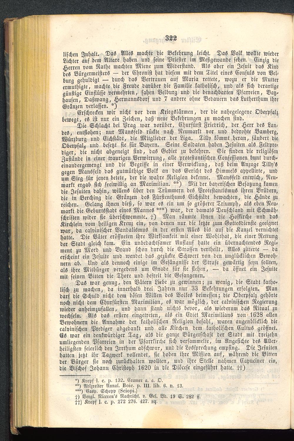 Die Schlacht bei Prag war vorüber, Churfürst Friedrich, der Herr des Lan-des, entflohen; nur Mansfeld rückte nach Neumarkt vor und bedrohte Bamberg ,Würzburg und Eichstädt, die Mitglieder der Liga. Tilly kommt heran, säubert dieOberpfalz und besetzt sie für Bayern. Seine Soldaten haben Jesuiten als Feldpre-diger, die nicht abgeneigt sind, das Gebiet zu bekehren. Sie finden die religiösenZustände in einer traurigen Verwirrung, alle protestantischen Confessionen bunt durch-einandergemengt und die Begriffe in einer Verwicklung, daß beim Anzüge Tilly'Sgegen Mansfeld daS gutmüthige Volk an das Gericht des Himmels appellirte, undum Sieg für jenen betete, der die wahre Religion bekenne. Mansfeld entwich, Neu-markt ergab sich freiwillig an Maximilian. Mit der bayerischen Besatzung kamendie Jesuiten dahin, willens über den Trümmern deS Protestantismus ihren Brüdern,die in Berching die Gränzen deS Fürstenthums Eichstädt bewachten, die Hände zureichen. Gelang ihnen dieß , so war eS ein um so größerer Triumph, als eben Neu-markt die Geburtsstadt eines ManneS war, der damals Deuschland mit Schmäh-schriften Wider sie überschwemmte. 5) Man räumte ihnen die Hofkirche und dasKirchlein vom heiligen Kreuz ein, von denen nur die letzte zum Gottesdienste geeignetwar, da calvinischer Vandalismus in der ersten Alles bis auf die Kanzel vernichtethatte. Die Väter eröffneten ihre Wirksamkeit mit einer Wohlthat, die einer Rettungder Stadt gleich kam. Ein unbedachtsamer Auflauf hatte ein übernachtendes Regi-ment zu Mord und Brand schon durch die Strassen vertheilt, Alles zitterte — daerscheint ein Jesuite und wendet das gezückte Schwert von den unglücklichen Bewoh-nern ab. Und als dennoch einige im Gefängnisse der Strafe gewärtig seyn sollten,als ihre Mitbürger vergebens um Gnade für sie flehen, — da öffnet ein Jesuitemit seinen Bitten die Thore und befreit die Gefangenen.