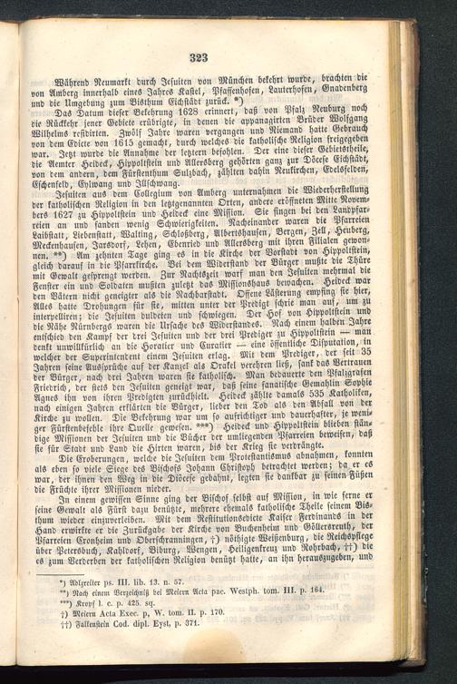 Das Datum dieser Bekehrung 1623 erinnert, daß von Pfalz Neuburg nochdie Rückkehr jener Gebiete erübrigte, in denen die appanagirten Brüder WolsgangWilhelms rcsidirten. Zwölf Jahre waren vergangen und Niemand hatte Gebrauchvon dem Edicte von 1615 gemacht, durch welches die katholische Religion freigegebenwar. Jetzt wurde die Annahme der letztem befohlen. Der eine dieser Gebietstheile,die Aemter Heideck, Hippoltstein und Allersberg gehörten ganz zur Döcese Eichstädt,von dem andern, dem Fürstenthum Sulzbach, zählten dahin Neukirchen, Edelsfelden,Eschenfeld, Eylwang und Jllschwang.