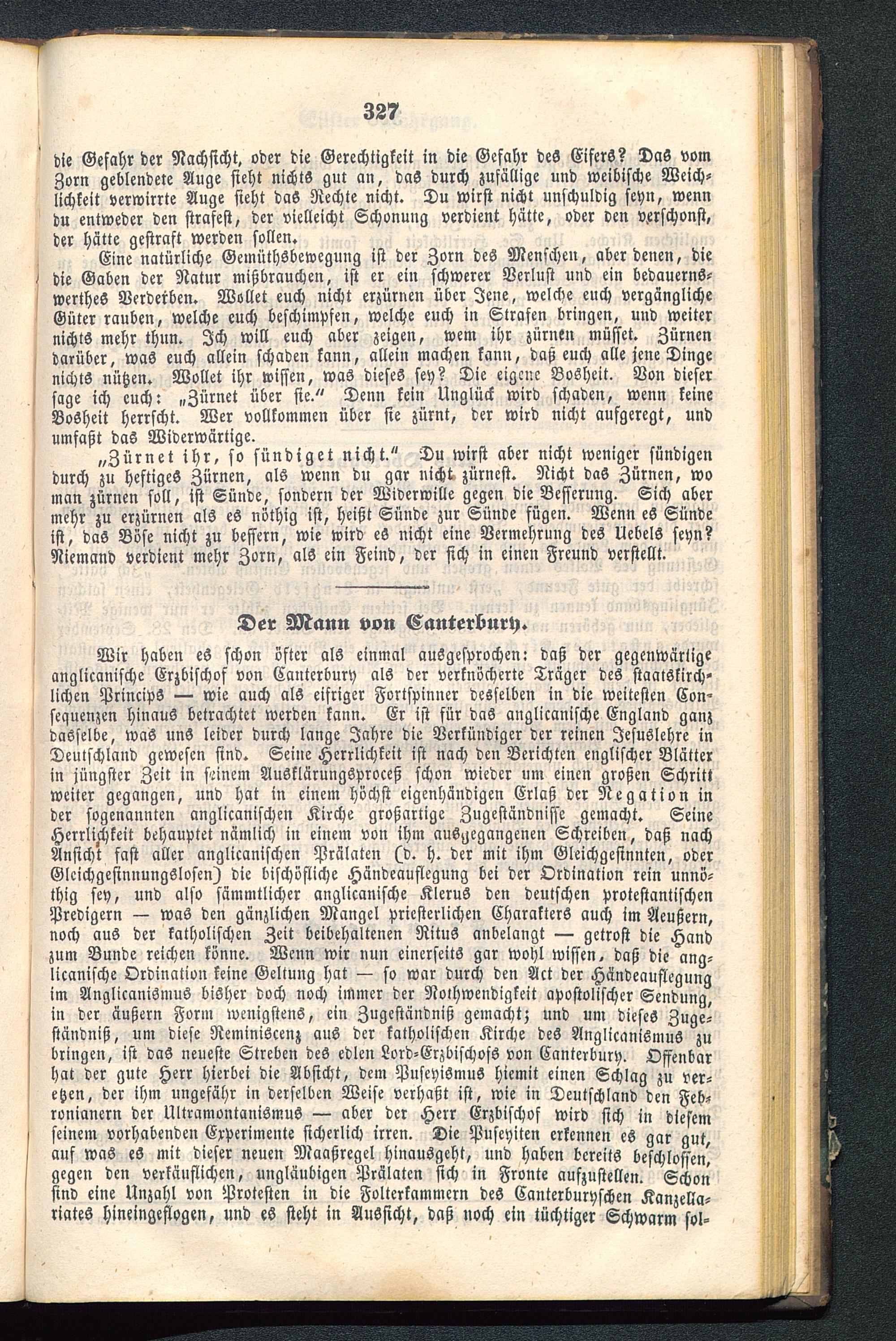 Wir haben es schon öfter als einmal ausgesprochen: daß der gegenwärtigeanglikanische Erzbischof von Canterbury als der verknöcherte Träger des staatskirch-lichen Princips — wie auch als eifriger Fortspinner desselben in die weitesten Con-sequenzen hinaus betrachtet werden kann. Er ist für das anglicanische England ganzdasselbe, was uns leider durch lange Jahre die Verkündiger der reinen Jesuslehre inDeutschland gewesen sind. Seine Herrlichkeit ist nach den Berichten englischer Blätterin jüngster Zeit in seinem Ausklärungsproceß schon wieder um einen großen Schrittweiter gegangen, und hat in einem höchst eigenhändigen Erlaß der Negation inder sogenannten anglicanischen Kirche großartige Zugeständnisse gemacht. SeineHerrliMeit behauptet nämlich in einem von ihm ausgegangenen Schreiben, daß nachAnsicht fast aller anglicanischen Prälaten O h. der mit ihm Gleichgesinnten, oderGlcichgesinnungslosen) die bischöfliche Händeauflegung bei der Ordination rein unnö-thig sey, und also sämmtlicher anglicanische Klerus den deutschen protestantischenPredigern — was den gänzlichen Mangel pricsterlichen Charakters auch im Aeußern,noch aus der katholischen Zeit beibehaltenen Ritus anbelangt — getrost die Handzum Bunde reichen könne. Wenn wir nun einerseits gar wohl wissen, daß die ang-licanische Ordination keine Geltung hat — so war durch den Act der Händeauflegunaim Anglicanismus bisher doch noch immer der Nothwendigkeit apostolischer Sendung,in der äußern Form wenigstens, ein Zugeständniß gemacht; und um dieses Zuge-ständnis), um diese Reminiscenz aus der katholischen Kirche des Anglicanismus zubringen, ist das neueste Streben des edlen Lord-Erzbischofs von Canterbury . Offenbarhat der gute Herr hierbei die Absicht, dem PuseyiSmuS hiemit einen Schlag zu ver-etzen, der ihm ungefähr in derselben Weise verhaßt ist, wie in Deutschland den Feh-ronianern der Ultramontanismus — aber der Herr Erzbischof wird sich in diesemseinem vorhabenden Experimente sicherlich irren. Die Puseyiten erkennen es gar gut,auf was eS mit dieser neuen Maaßregel hinausgeht, und haben bereits beschlossen^gegen den verkäuflichen, ungläubigen Prälaten sich in Fronte aufzustellen. Schonsind eine Unzahl von Protesten in die Folterkammern des Canterburyschen Kanzella-riates hineingeflogen, und es steht in Aussicht, daß noch ein tüchtiger Schwärm sol-