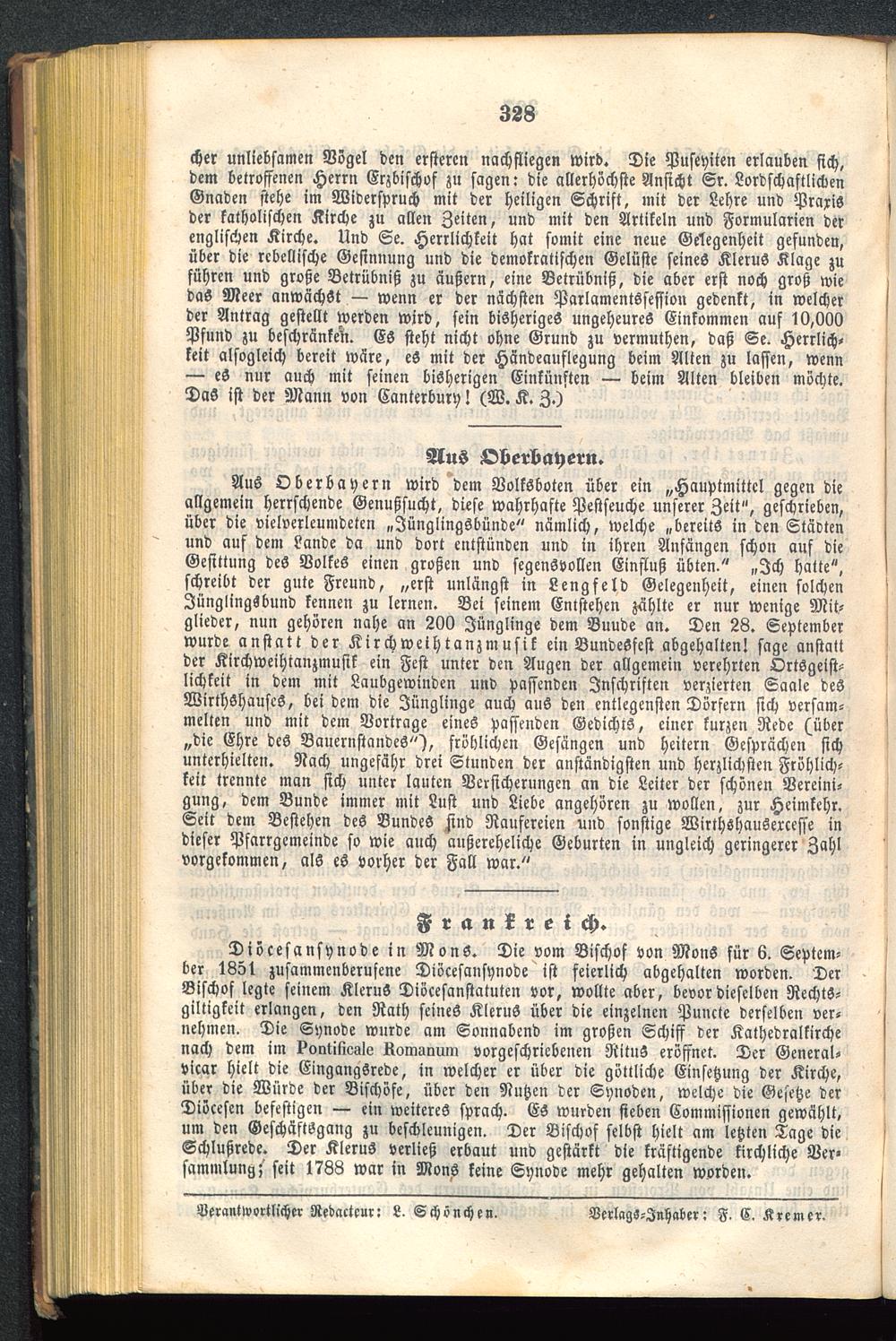 cher unliebsamen Vögel den ersteren nachfliegen wird. Die Puseyiten erlauben sich,dem betroffenen Herrn Erzbischof zu sagen: die allerhöchste Ansicht Sr. LordschaftlickenGnaden stehe im Widerspruch mit der heiligen Schrift, mit der Lehre und Praxisder katholischen Kirche zu allen Zeiten, und mit den Artikeln und Formularien derenglischen Kirche. Und Se. Herrlichkeit hat somit eine neue Gelegenheit gefunden,über die rebellische Gesinnung und die demokratischen Gelüste seines KleruS Klage zuführen und große Betrübniß zu äußern, eine Betrübniß, die aber erst noch groß wiedaS Meer anwächst — wenn er der nächsten Parlamentssession gedenkt, in welcherder Antrag gestellt werden wird, sein bisheriges ungeheures Einkommen auf 10,0(10Pfund zu beschränken. ES steht nicht ohne Grund zu vermuthen, daß Se. Herrlich-keit alsogleich bereit wäre, eS mit der Händeauflegung beim Alten zu lassen, wenn— eS nur auch mit seinen bisherigen Einkünften — beim Alten bleiben möchte.Das ist der Mann von Canterbury! (W. K. Z.)