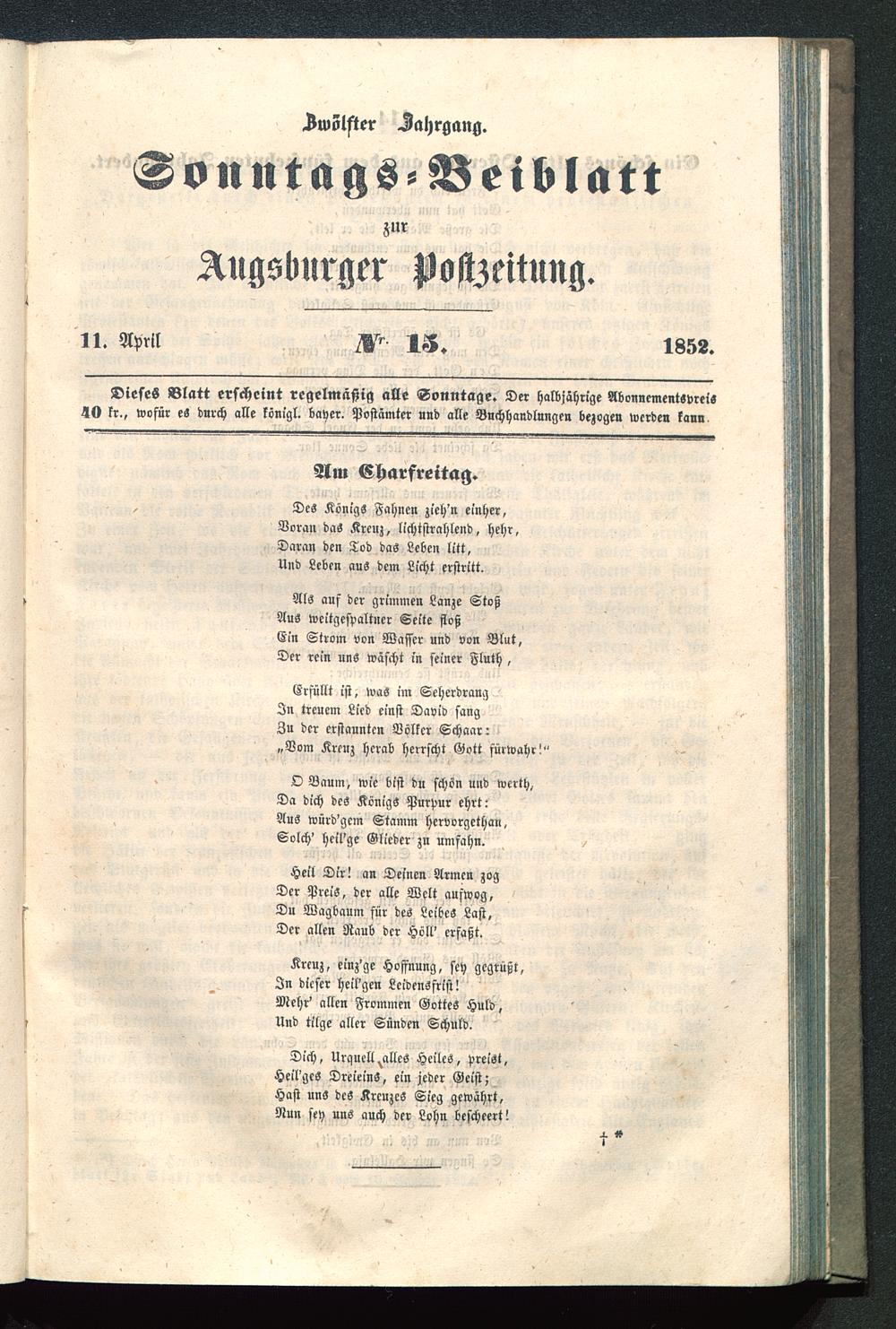 Dieses Blatt erscheint regelmäßig alle Sonntage. Der halbjährige Abonnements»«!«kr., wofür es durch alle königl. bayer. Postämter nud alle Buchhandlungen bezogen werden kann.
