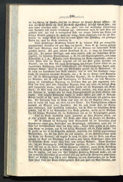Unser Höchstseliger Großherzog Leopold K. H. bekannte Sich zur evangelisch,protestantischen Konfession bis zum Enhe des Lebens. Seine K. H. konnten deßhalbnicht durch Abhaltung eines Seelenamtes zu den Gliedern der katholischen Kirche gerechnet werden. Ein ganz anderes Verhältniß ist eS, so lange der Landesregentnoch lebt. Da werden allerdings, auch wenn derselbe nicht der katholischen Kirche angehört, bei besondern Veranlassungen, z. B. bei dem Regierungsantritt, dem hohenNamenöfeste u. f. w., Meßopfer durch Anordnung der Kirche dargebracht, allein indiesen Fällen wird der Regent aufgefaßt als der von Gott gesetzte Herrscher deSStaates, und von Gott ihm durch Darbringung deö heiligen Opfers erfleht die zursegensreichen Vollführung seines höchstwichtigen und höchsteinflußreichen AmteS noth-wendigen Gaben. Oder eS wird dem Allerhöchsten gedankt für die Wohlthaten, dieEr durch den LandeSvater dem Volke erwiesen, oder eS wird das Dankopfer darge-bracht für besonders erfreuliche Ereignisse, wie z. B. für die Geburt eines KronpriN-zen, für die Wiedergenesung eines erkrankten Regenten, für die Beseitigung drohen-der Gefahren, wie ich auch nach Bewältigung der Revolution und nach Wiederein-setzung der rechtmäßigen Regierung ein feierliches Amt zur Zeit angeordnet habe.Nach dem Tode eines nicht katholischen Regenten kann nur dann ein heiliges Meß-opfer dargebracht werden, wenn sich dasselbe bezieht auf die Segnungen und Wohl-thaten, die Gott durch seine Regierung dem Volke erwiesen, also wenn ee> ein Lob-und Dankamt ist, welches aber bei einem Trauergottesdienst zu feiern offenbar nichtangeht. DaS religiöse Bekenntniß kommt in solchen Fällen gar nicht in Betracht.Anders verhält eS sich, wenn für den Verblichenen ein Seelenamt soll gehalten wer-den. Ein Seelenamt kann die Kirche nicht mehr für ihn als Regenten feiern, son-dern eS bezieht sich einzig und aNein auf seine Person. Der Dahingeschiedene erscheintnunmehr als Mitglied seiner Konfession. Für ihn nach seinem Tode ein Seelen-opfer darbringen, hieße thatsächlich auSsprechen, daß Er Glied der katholischen Kirchegewesen, daß Er in der Gemeinschaft der Kirche gestorben, welche an die Wirksam-keit deS heiligen Meßopfers für die Verstorbenen und an den ReinigungSort glaubt.