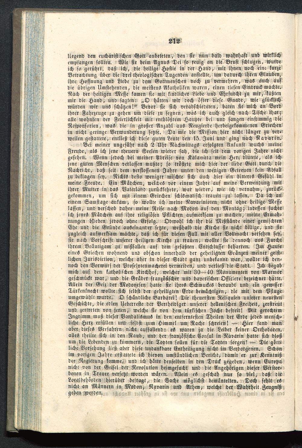 Bei meiner ungefähr nach 2 Uhr Nachmittags erfolgten Ankunft wuchs meineFreude, als ich jene theuern Seelen wieder sah, die ich seit dem vorigen Jahre nichtgesehen. Wenn jedoch bei meiner Abreise von Kalamata mein Herz blutete, als ichjene guten Menschen verlassen mußte; so tröstete mich hier der liebe Gott durch dieNachricht, daß seit dem verflossenen Jahre unter den wenigen Gelreuen kein Abfallzu beklagen sey. Nichts desto weniger mischte sich auch hier ein bitteres Gefühl inmeine Freude. Ein Mädchen, welches vor einem Jahre auf meine Verwendung mitihrer Mutter in daS Vaterland zurückkehrte, war wieder, wie ich vernahm, zurück-gekommen, um sich mit einem Griechen schismatisch trauen-!zu lassen. Da ich aneinem Samstage ankam, so wollte ich meine Navarinioten nicht ohne heilige Messelassen, und verschob daher meine Reise nach Modon auf den Montag; indessen suchteich jenes Mävchen auf ihre religiösen Pflichten aufmerksam zu machen, meine Ermah-nungen blieben jedoch ohne Erfolg. Obwohl ich ihr die Mißstände einer gemischtenEhe und die Gründe auseinander setzte, weßhalb die Kirche sie nicht billige, und siezugleich aufmerksam machte, daß ich für diesen Fall mit aller Vollmacht versehen sey,sie nach Vorschrift unserer heiligen Kirche zu trauen, wollte sie dennoch auS Furchtihrem Bräutigam 'zu mißfallen auf dem gefaßten Entschlüsse beharren. Im HauseeineS Griechen wohnend und obschon innerhalb der geheiligten Gränzen meiner geist-lichen Jurisdiktion, welche aber in dieser Stadt ganz unbekannt war, wollte ich den-noch den Vorwurf ver Proselytcnmacherei vermeiden, und verließ die Stadt. Ich begabmich auf den katholischen Kirchhof, welcher mit 30—40 Monumenten von Marmorgeschmückt war, und die Gräber französischer und bayerischer Officiere bezeichnet Halle.Allein der Geiz der Modonesen halte sie ihres Schmuckes beraubt und ein gewisserTürkenknecht wollle sich selbst der geheiligten Erde bemächtigen, die mit dein Pflugeumgewühlt wurde. O schändliche Barbarei! Die theuersten Reliquien unserer neuestenGeschichte, die edlen Ucberrestc der Verlheidiger unserer hellenischen Freiheit, zerstreutund zertreten von jenen, welche sie von dem türkischen Joche befreit! Mit gerechtemIngrimm, muß dieser VandaliömuS in den entfernlesten Theilen der Erde jedes mensch-liche Herz erfüllen und selbst zum Himmel um Rache schreien! — Hier fand manaber dieses Verfahren nicht auffallend: eS waren ja die Leiber keiner Orthodoren,alles lheilte sich in den Raub, und der französische Consul in Navarin hatte sich bloßum die Lebenden zu kümmeru, die Todten sollen für die Todten sorgen! — Die gött-liche Vorsehung ließ aber diese undankbare Enthciligung nicht im Verborgenen. Schonim vorigen Jahre erstattete ich hievon umständlichen Bericht, damit er zur Kenntnißder Regierung komme, und ich hätte denselben in den Druck gegeben, wenn Europa nicht von der Geisel der Revolution heimgesucht und die Angehörigen dieser Verstor-benen in Trauer versetzt worden wären. Allein es geschah nur so viel, daß-Ndij?!Locaibehördcn hierüber befragt, die Sache möglichst bemäntelten. Doch fehltieSnicht an Männern in Modon, Navarin und Athen , welche der Wahrheit Zeugnißgy^IVVpMjli jchognl? i!»iij57g ni sss ?m 5nu n,6vgmu sfMdloZ. msni» ni n»?