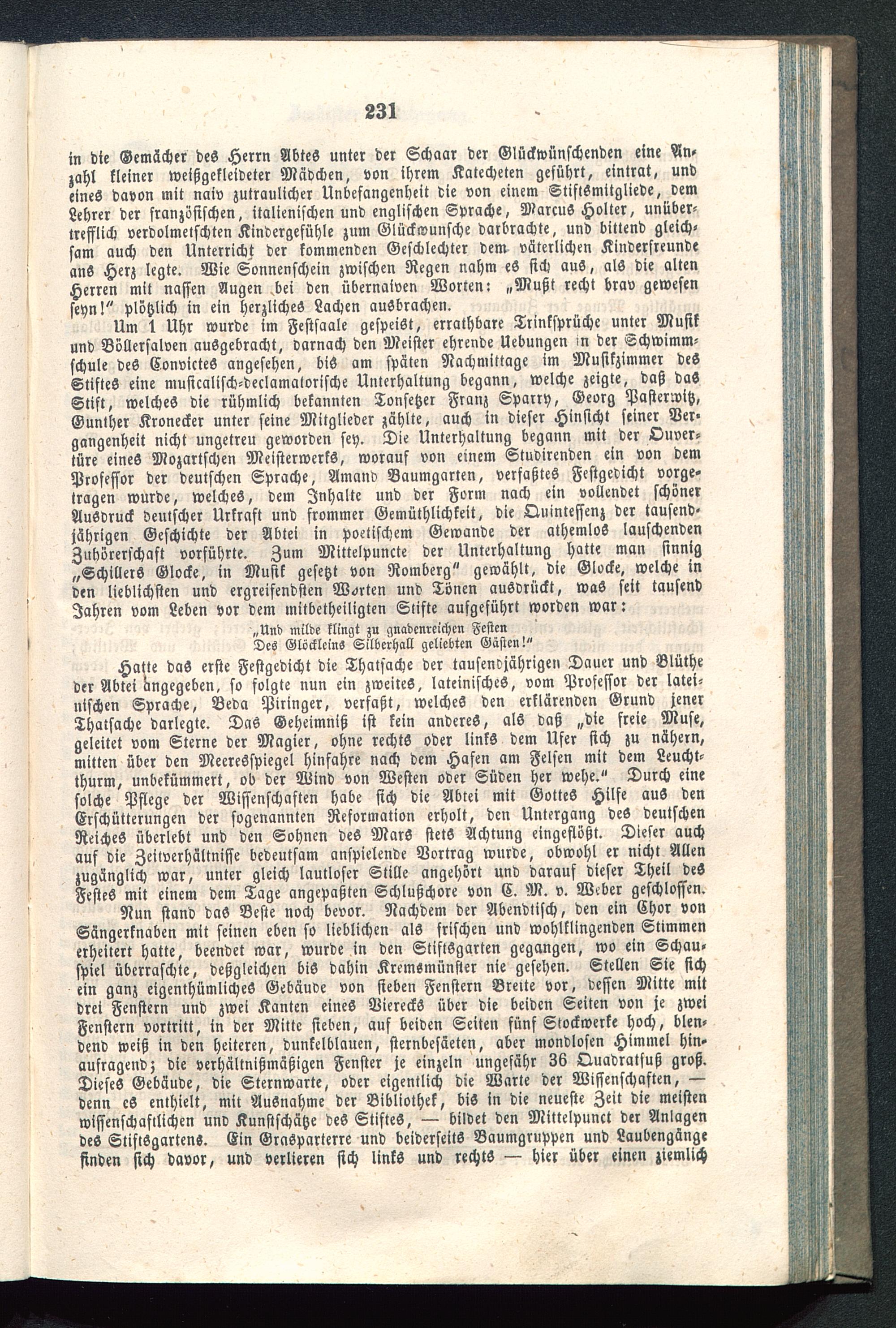 Um 1 Uhr wurde im Festsaale gespeist, errathbare Trinksprüche unter Musikund Böllersalven ausgebracht, darnach den Meister ehrende Uebungen in der Schwimm-schule des ConvicteS angesehen, bis am späten Nachmittage im Musikzimmer deSStiftes eine musicalisch-declamatorische Unterhaltung begann, welche zeigte, daß daSStift, welches die rühmlich bekannten Tonsetzer Franz Sparry, Georg Pafterwitz,Günther Kronecker unter seine Mitglieder zählte, auch in dieser Hinsicht seiner Ver-gangenheit nicht ungetreu geworden sey. Die Unterhaltung begann mit der Ouver-türe eines Mozartschen Meisterwerks, worauf von einem Studirenden ein von demProfessor der deutschen Sprache, Amand Baumgarten, verfaßtes Festgedicht vorge-tragen wurde, welches, dem Inhalte und der Form nach ein vollendet schönerAusdruck deutscher Urkraft und frommer Gemüthlichkeit, die Quintessenz der tausend-jährigen Geschichte der Abtei in poetischem Gewände der athemloS lauschendenZuhörerschaft vorführte. Zum Mittelpuncte der Unterhaltung hatte man sinnig„Schillers Glocke , in Musik gesetzt von Romberg" gewählt, die Glocke, welche inden lieblichsten und ergreifendsten Werten und Tönen ausdrückt, was seit tausendJahren vom Leben vor dem mitbetheiligten Stifte aufgeführt worden war: