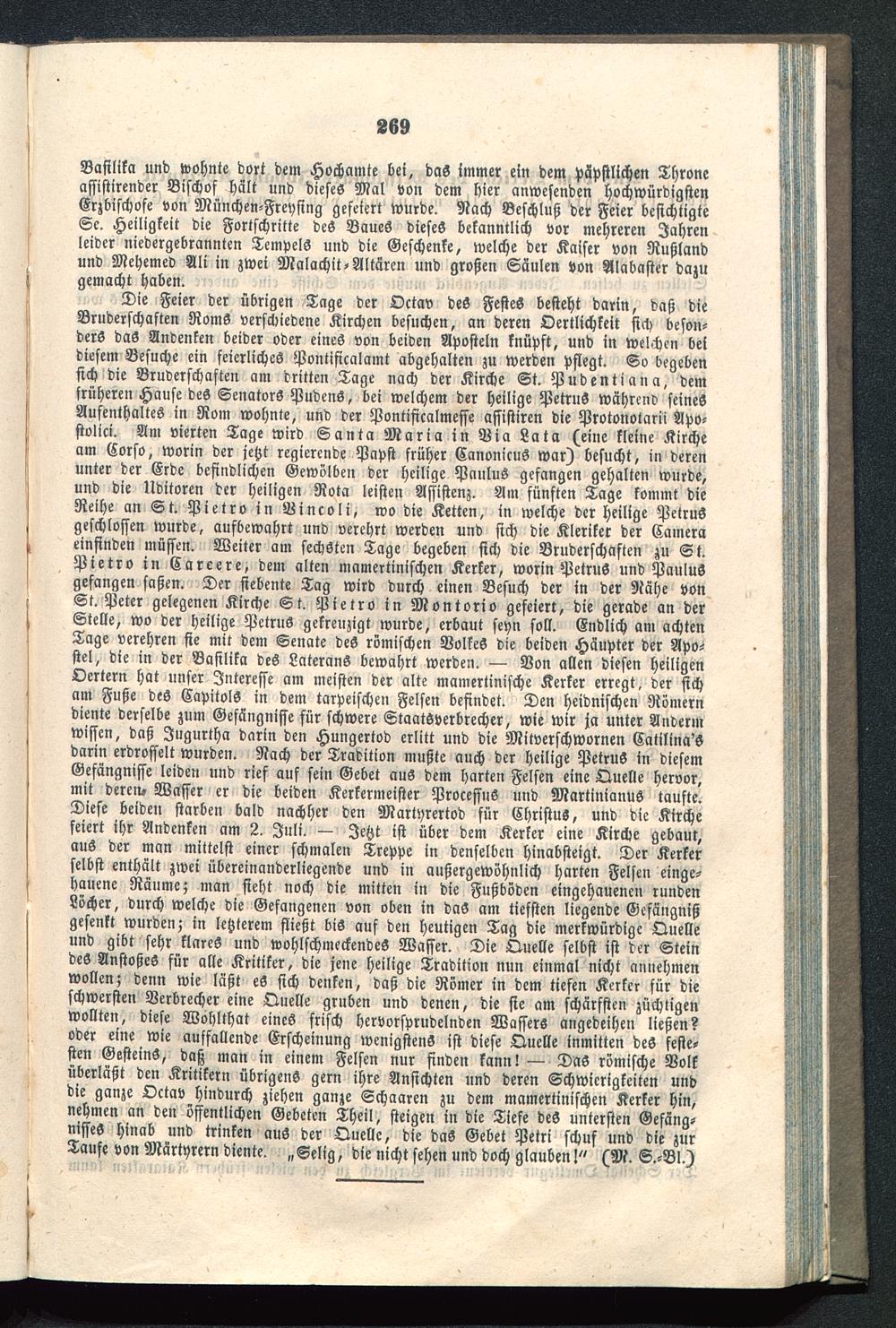 Die Feier der übrigen Tage der Octav deS Festes besteht darin, daß dieBruderschaften Roms verschiedene Kirchen besuchen, an deren Oertlichkeit sich beson-ders das Andenken beider oder eines von beiden Aposteln knüpft, und in welchen beidiesem Besuche ein feierliches Pontificalamt abgehalten zu werden pflegt. So begebensich die Bruderschaften am dritten Tage nach der Kirche St. Pudentiana , demfrüheren Hause des Senators Pudens, bei welchem der heilige PetruS während seinesAufenthaltes in Rom wohnte, und der Pontificalmesse assistiren die Protonotarii Apo-stolici. Am vierten Tage wird Santa Maria in Via Lata (eine kleine Kircheam Corso, worin der jetzt regierende Papst früher Canonicus war) besucht, in derenunter der Erde befindlichen Gewölben der heilige Paulus gefangen gehalten wurde,und die Uditoren der heiligen Rota leisten Assistenz. Am fünften Tage kommt dieReihe an St. Pietro in Bincoli, wo die Ketten, in welche der heilige PetruSgeschlossen wurde, aufbewahrt und verehrt werden und sich die Kleriker der Cameraeinfinden müssen. Weiter am sechsten Tage begeben sich die Bruderschaften zu St.Pietro in Carcere, dem alten mamertinischen Kerker, worin PetruS und PauluSgefangen saßen. Der siebente Tag wird durch einen Besuch der in der Nähe vonSt. Peter gelegenen Kirche St. Pietro in Montorio gefeiert, die gerade an derStelle, wo der heilige Petrus gekreuzigt wurde, erbaut seyn soll. Endlich am achtenTage verehren sie mit dem Senate deS römischen Volkes die beiden Häupter der Apo-stel, die in der Basilika des Laterans bewahrt werden. — Von allen diesen heiligenOertern hat unser Interesse am meisten der alte mamertinische Kerker erregt, der sicham Fuße des CapitolS in dem tarpeischen Felsen befindet. Den heidnischen Römerndiente derselbe zum Gefängnisse für schwere Staatsverbrecher, wie wir ja unter Ander»,wissen, daß Jugurtha darin den Hungertod erlitt und die Mitverschwornen Catilina'Sdarin erdrosselt wurden. Nach der Tradition mußte auch der heilige PetruS in diesemGefängnisse leiden uud rief auf sein Gebet aus dem harten Felsen eine Quelle hervor,mit deren» Wasser er die beiden Kerkermeister Processuö und Martinianus taufte.Diese beiden starben bald nachher den Martyrertod für Christus, und die Kirchefeiert ihr Andenken am 2. Juli. — Jetzt ist über dem Kerker eine Kirche gebaut,aus der man mittelst einer schmalen Treppe in denselben hinabsteigt. Der Kerkerselbst enthält zwei übereinanderliegende und in außergewöhnlich harten Felsen einge-hauene Räume; man sieht noch die mitten in die Fußböden eingehauenen rundenLöcher, durch welche die Gefangenen von oben in daS am tiefsten liegende Gefängnißgesenkt wurden; in letzterem fließt bis auf den heutigen Tag die merkwürdige Quelleund gibt sehr klares und wohlschmeckendes Wasser. Die Quelle selbst ist der SteindeS Anstoßes für alle Kritiker, die jene heilige Tradition nun einmal nicht annehmenwollen; denn wie läßt es sich denken, daß die Römer in dem tiefen Kerker für dieschwersten Verbrecher eine Quelle gruben und denen, die sie am schärfsten züchtigenwollten, diese Wohlthat eines frisch hervorsprudelnden Wassers angedeihen ließen?oder eine wie ausfallende Erscheinung wenigstens ist diese Quelle inmitten des feste-sten Gesteins, daß man in einem Felsen nur finden kann! — Das römische Volküberläßt den Kritikern übrigens gern ihre Ansichten und deren Schwierigkeiten unddie ganze Octav hindurch ziehen ganze Schaaren zu dem mamertinischen Kerker hin,nehmen an den öffentlichen Gebeten Theil, steigen in die Tiefe deS untersten Gefäng-nisses hinab und trinken aus der Quelle, die das Gebet Petri schuf und die zurTaufe von Märtyrern diente. „Selig, die nicht sehen und doch glauben!" (M. S.-BI.)