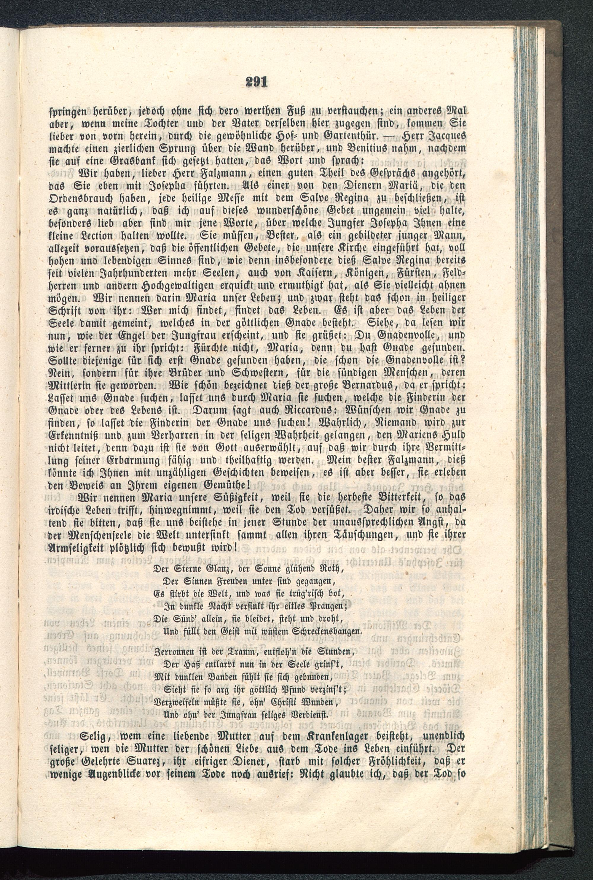 Wir haben, lieber Herr Falzmann, einen guten Theil des Gesprächs angehört,daS Sie eben mit Josepha führten. Als einer von den Dienern Mariä, die denOrdensbrauch haben, jede heilige Messe mit dem Salve Regina zu beschließen, isteS ganz natürlich, daß ich auf dieses wunderschöne Gebet ungemein viel halte,besonders lieb aber sind mir jene Worte, über welche Jungfer Josepha Ihnen einekleine Lection halten wollte. Sie müssen, Bester, als ein gebildeter junger Mann,allezeit voraussetzen, daß die öffentlichen Gebete, die unsere Kirche eingeführt hat, vollhohen und lebendigen Sinnes sind, wie denn insbesondere dieß Salve Regina bereitsseit vielen Jahrhunderten mehr Seelen, auch von Kaisern, Königen, Fürsten , Feld-herren und andern Hochgewaltigen erquickt und ermuthigt hat, als Sie vielleicht ahnenmögen. Wir nennen darin Maria unser Leben; und zwar steht daS schon in heiligerSchrift von ihr: Wer mich findet, findet daS Leben. ES ist aber das Leben derSeele damit gemeint, welches in der göttlichen Gnade besteht. Siehe, da lesen wirnun, wie der Engel der Jungfrau erscheint, und sie grüßet: Du Gnadenvollc, undwie er ferner zu ihr spricht: Fürchte nicht, Maria, denn du hast Gnade gesunden.Sollte diejenige für sich erst Gnade gefunden haben, die schon die Gnadenvolle ist?Nein, sondern für ihre Brüder und Schwestern, für die sündigen Menschen, derenMittlerin sie geworden. Wie schön bezeichnet dieß der große Bernardus, da er spricht:Lasset unS Gnade suchen, lasset unS durch Maria sie suchen, welche die Finderin derGnade oder des Lebens ist. Darum sagt auch RiccarduS: Wünschen wir Gnade zufinden, so lasset die Finderin der Gnade uns suchen! Wahrlich, Niemand wird zurErkenntniß und zum Verharren in der seligen Wahrheit gelangen, den Mariens Huldnicht leitet, denn dazu ist sie von Gott auöerwählt, auf daß wir durch ihre Vermitt-lung seiner Erbarmung fähig und theilhaftig werden. Mein bester Falzmann, dießkönnte ich Ihnen mit unzähligen Geschichten beweisen, eS ist aber besser, sie erlebenden Beweis an Ihrem eigenen Gemüthe!