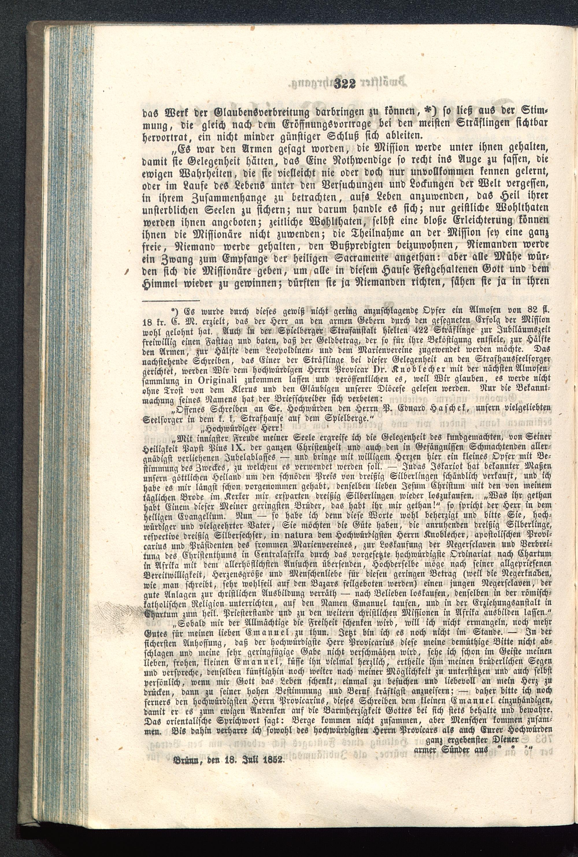 „Mit innigster Freude meiner Seele ergreife ich die Gelegenheit des kundgemachten, von SeinerHeiligkeit Papst Pius IX. der ganzen Christenheit und auch den in Gefängnissen Schmachtenden aller-gnädigst verliehenen Jubelablasses — und bringe mit willigem Herzen hier ein kleines Opfer mit Be-stimmung des Zweckes, zu welchem es verwendet werden soll. — Judas Jskariot hat bekannter Maßenunsern göttlichen Heiland um den schnöden Preis von dreißig Silberlingen schändlich verkauft, und ichhabe es mir längst schon vorgenommen gehabt, denselben lieben Jesum Christum mit den von meinemtäglichen Brode im Kerker mir ersparten dreißig Silberlingen wieder loszukaufen. „Was ihr gethanhabt Einem dieser Meiner geringsten Brüder, das habt ihr mir gethan!" so spricht der Herr in demheiligen Evangelium. Nun — so habe ich denn diese Worte wohl beherzigt und bitte Sie, hoch-würdiger und vielgeehrter Bater, Sie möchten die Güte haben, die anruhenden dreißig Silberlinge,respective dreißig Silbersechser, in nsturs dem Hochwürdigsten Herrn Knoblecher, apostolischen Provi-cariuS und Präsidenten des frommen Marienvereines, zur Loskaufung der Negersclaven und Verbrei-tung des Christenthums in Centralafrika durch das vorgesetzte hochwürdigste Ordinariat nach Chartum in Afrika mit dem allerhöflichsten Ansuchen übersenden, Höchderselbc möge nach seiner allgepriesencnBereitwilligkeit, Herzensgröße und Menschenliebe für diesen geringen Betrag (weil die Negerknäben,wie man schreibt, sehr wohlfeil auf den Bazars feilgeboten werden) einen jungen Negersclaven, dergute Anlagen zur christlichen Ausbildung verräth — nach Belieben loskaufen, denselben in der römisch-katholischen Religion unterrichten, auf den Namen Emanuel taufen, und in der Erziehungsanstalt inChartum zum heil. Pricstersiande und zu den weitern christlichen Missionen in Afrika ausbilden lassen."
