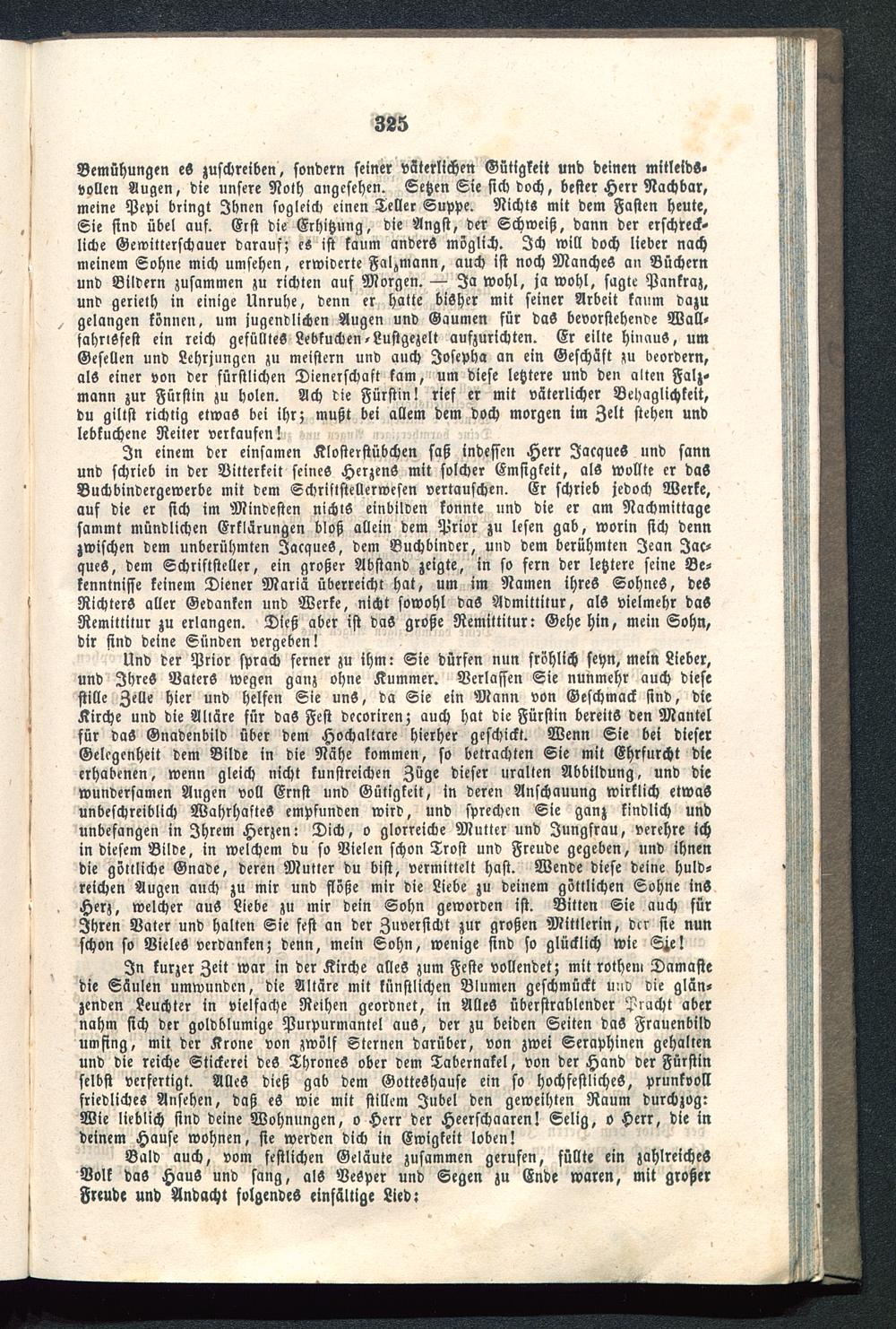 Und der Prior sprach ferner zu ihm: Sie dürfen nun fröhlich seyn, mein Lieber,und JhreS VaterS wegen ganz ohne Kummer. Verlassen Sie nunmehr auch diesestille Zelle hier und helfen Sie unS, da Sie ein Mann von Geschmack sind, dieKirche und die Alläre für daS Fest decoriren; auch hat die Fürstin bereits den Mantelfür daS Gnadenbild über dem Hochaltare hierher geschickt. Wenn Sie bei dieserGelegenheit dem Bilde in die Nähe kommen, so betrachten Sie mit Ehrfurcht dieerhabenen, wenn gleich nicht kunstreichen Züge dieser uralten Abbildung, und diewundersamen Augen voll Ernst und Gütigkeit, in deren Anschauung wirklich etwasunbeschreiblich Wahrhaftes empfunden wird, und sprechen Sie ganz kindlich undunbefangen in Ihrem Herzen: Dich, o glorreiche Mutter und Jungfrau, verehre ichin diesem Bilde, in welchem du so Vielen schon Trost und Freude gegeben, und ihnendie göttliche Gnade, deren Mutler du bist, vermittelt hast. Wende diese deine huld-reichen Augen auch zu mir und flöße mir die Liebe zu deinem göttlichen Sohne inSHerz, welcher auS Liebe zu mir dein Sohn geworden ist. Bitten Sie auch fürIhren Vater und halten Sie fest an der Zuversicht zur großen Mittlerin, dcr sie nunschon so Vieles verdanken; denn, mein Sohn, wenige sind so glücklich wie S^e!