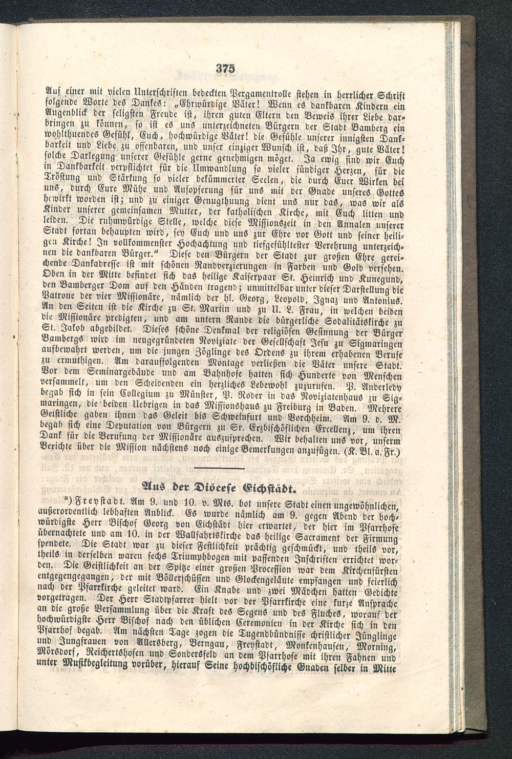 Auf einer mit vielen Unterschriften bedeckten Pergamentrolle stehen in herrlicher Schriftfolgende Worte des DankeS: „Ehrwürdige Väter! Wenn es dankbaren Kindern einAugenblick der seligsten Freude ist, ihren guten Eltern den Beweis ihrer Liebe dar-bringen zu können, so ist es uns unterzeichneten Bürgern der Stadt Bamberg einwohlthuendes Gefühl, Euch, hvchwürdige Väter! die Gefühle unserer innigsten Dank-barkeit und Liebe zu offenbaren, und unser einziger Wunsch ist, daß Ihr, gute Väter!solche Darlegung unserer Gefühle gerne genehmigen möget. Ja ewig sind wir Euchin Dankbarkeit verpflichtet für die Umwandlung so vieler sündiger Herzen, sür dieTröstung und Stärkung so vieler bekümmerter Seelen, die durch Euer Wirken beiuns, durch Eure Mühe und Aufopferung für uns mit der Gnade unseres GotteShl wirkt worden ist; und zu einiger Genugthuung dient unS nur daS, was wir alsKinder unserer gemeinsamen Mutter, der katholischen Kirche , mit Euch litten undleiden. Die ruhmwürdige Stelle, welche diese MissionSzeit in den Annalen unsererStadt fortan behaupten wird, sey Euch und unS zur Ehre vor Gott und seiner heili-gen Kirche! In vollkommenster Hochachtung und tiefgefühltester Verehrung untcrzeich»nen die dankbaren Bürger." Diese den Bürgern der Stadt zur großen Ehre gerei-chende Dankadresse ist mit schönen Randverzierungen in Farben und Gold versehen.Oben in der Mitte befindet sich daS heilige Kaiserpaar St. Heinrich und Kunegund,den Bamberger Dom aus den Händen tragend; unmittelbar unter dieser Darstellung diePatrone der vier Missionäre, nämlich der hl. Georg, Leopold, Jgnaz und AntoniuS.An den Seiten ist die Kirche zu St. Martin und zu N. L. Frau, in welchen beidendie Missionäre predigten, und am untern Rande die bürgerliche SodalitätSkirche zuSt. Jakob abgebildet. Dieses schöne Denkmal der religiösen Gesinnung der BürgerBambergs wird im nengegründeten Noviziate der Gesellschaft Jesu zu Sigmaringen aufbewahrt werden, um die jungen Zöglinge des Ordens zu ihrem erhabenen Berufezu ermuthigen. Am darauffolgenden Montage verließen die Väter unsere Stadt.Vor dem Seminargebäude und am Bahnhöfe hatten sich Hunderte von Menschenversammelt, um den Scheidenden ein herzliches Lebewohl zuzurufen. P. Auderledybegab sich in sein Kollegium zu Münster, P. Roder in daö Noviziatenhaus zu Sig-maringen , die beiden Uebrigen in das Missionshaus zu Freiburg in Baden. MehrereGeistliche gaben ihnen daS Geleit bis Schweinfurt und Vorchheim. Am 9. d. M.begab sich eine Deputation von Bürgern zn Sr. Erzbischöflichen Ercellenz, um ihrenDank für die Berufung der Missionäre auSzusprechcn. Wir behalten unS vor, unsermBerichte über die Mission nächstens noch einige Bemerkungen anzufügen. (K. Bl. a.Fr.)