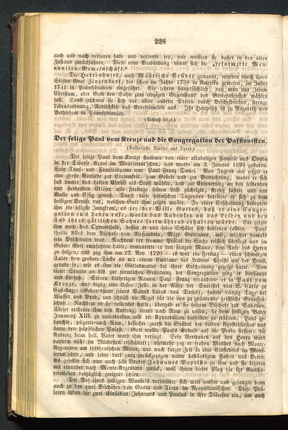 Der selige Paul vom Kreuze stammte von einer altadeligen Familie aus Ovadaiu der Diöcese Acqui im Moutferrat'scheu, und wurde am 3. Januar ll>91 gebore».Sein Tanf- und Familicuname war Paul Franz Danei. Von Jngcnd ans zeigte ereine große Borliebe zur Einsamkeit, zum Gebete und zur Betrachtung, wobei er sichfast immer das Leiden Christi als Stoff wählte, und znr Erinnernng an den leidendenund sterbenden Erlöser alle Freitage seinen Leib züchtigte, streng fastete und nurGalle und Essig genoß. Durch diese heroischen Tugenden bereitete er sich zu demheilige» Berufe vor, welchen Golt ihm zeigen wollte. Iu einer Erscheinung bedeuteteihm die seligste Jungfrau, eS sey der Wille Gottes, daß er eine Cougre-gativn in'S Leben ruse, worin das Andenken an das Leide» und de»Tod ihres göttliche» Sohnes fortwährend erhalten würde. Sie zeigteihm a»ch das Ordcnslleiv, dessen er uud seine Schüler sich bedicueu sollte». Pa»ltheilte ÄllcS dem Bischöfe vou Alcssandria, Msgr Gattinara, mit, welcher damalssein Beichtvater war. Nachdem der fromme Prälat die Sache reiflich überlegt und imGebcic Gott empfohlen hatte, ermunterte er den jnngeu Mauu, dem Rufe dcS Herr»zu folge», und zog ihm am 22. Nov. 172l) — es war ciu Freitag — eine» schwarzenTalar vo» grobem Tuche au mit einem Embleme des Leidens Christi ans der Brust,gerade so, wie eS ihm die Gottesmutter bei ihrer Erscheinung gezeigt hatte. Bondieser Stunde au bis zur formliche» Grüudimg der Congregativ» ging er barhauptund barfuß. Seinen bisherigen Namen Paul Franz veränderte er in Paul vomKrcnze, uud bezog eine kleine Zelle in der Nähe der Sacristci von S. Carlo zuCastellazz.) (Gcburlsstadt seines Vaters LncaS von Danei), fastete vierzig Tage beiWasser uud Brod, uud schrieb die Regel für die neu zu gründende geistliche Gcnofsen-schaft. Nachdem er sie vollendet hatte, übergab er sie seine», Bischöfe zur Sanction.Dieser ertheilte ihm dc» Auftrag, damit »ach Rom zu reisen, sie dem heilige» BaterJ»»oce»z XM. zu unterbreiten und die Approbation derselben zu erbitten. Paul ge.horchte, pilgerte^nach Rom, besuchte zuerst die Gräber der beide» Apostclfürsten unddann den päpstlichen Palast. Gott wollte Pauls Geduld auf die Probe stellen: dieAudienz beim heil. Bater ward ihm versagt. Sein Vertrauen ans den Herr» warddadurch «icht im Mindesten erschüttert; vielmehr zog er froheu MutheS nach Montc-Argcutaro am tvrrheuischcu Meere, uud nach kurzer Zeit in eine Einsiedelei im Mout.ferrat'schen, uud lebte dort ganz zmückgezogen unter bestäudigcm Fasten uud Beten.ES gesellte sich «uu auch sein Bruder JohauueS Baptista zu ihm uud sie kehrte»mit einander nach Monte-Arge»taro zurück, weil ihnen dieser Platz für ihr Anacho-retenlebcn vorzüglich geeignet schien.
