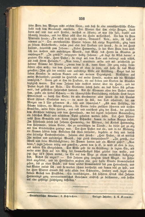 seine Frau den Morgen nicht erleben könne, und daß sie eine unaussprechliche Sehn-sucht nach dem Abendmahl empfände. Der Pfarrer that ihm einige Fragen, standdann auf und trat an'S Fenster, welches er öffnete; es war sehr kalt, dunkel undschaurig draußen, und der Wind pfiff über die Haide messerscharf. Da kam die FrauPfarrerin herein; „Du wirst doch nicht fahren, Edmund? Nein, nein, ich lasse esnimmer zu!" Der protestantische Pfarrer besann sich einige Augenblicke, ging dannzu seinem Blicherstande, nahm zwei oder drei Traktate und sprach, sie in der Handhaltend, freundlich zum Johann: „Lieber Harmening, so hat Eure Frau denn wirk-lich den wahren und aufrichtigen Wunsch, daS Mahl des Herrn im Glauben zuempfangen?" „Ja gewiß!" entgegnete hastig Johann: „es liegt ihr Alles daran! ozaudern Sie nicht, Herr Pastor; sie ringt mit dem Tode und verlangt nach nichts,als nach ihrem Heilande." „Nun denn," erwiederte milde und mit priefterlich ge,hobener Stimme der Pfarrer, „wenn dem so ist, dann könnt Ihr ganz ruhig heim-kehren ohne mich; vor dem Herrn wiid es eben so seyn, als habe sie das Mahlgenossen; Ihm gilt der redliche und ausrichtige Wille als Erfüllung. Saget das derlieben Kranken in meinem Namen und mir meinem SegenSgruß. Rücksichten aufmeine Gesundheit, zunächst im Hinblicke auf meine Familie, machen mir die Mitfahrtunmöglich." Dann gab er ihm die Traktate, die auf Leiden und Sterben im Glaubenbezüglich waren. Der arme Johann fuhr trostlos wieder über die Haive, und derPastor begab sich zur Ruhe. Die Sterbende indeß hatte an das Leben sich geklam-mert, des geistlichen Zuspruches harrend. Als ihr Ehemann ohne den Pastor wiederkam, zuckre ein herber Schmerz — die schmerzlichste Enttäuschung vielleicht ihres kurzenErdenlebenS — durch ihre Seele; die alte Großmutter aber sprach ihr deö PaulusEberS schönes Sterbelied vor; — da ward sie still, den Tod erharrend, der amMorgen um 5 Uhr gekommen ist, leise und schmerzlos." „Es war Frühling, dieBäume blühten, die Wiesen grünten, die Sonne lachte zwischen schweren und weißenGewölken, milde Lüfte spielten, und voll und rauschend ging der Fluß, der zwischendem Kirchhofe dahinzog und dem Herrnhause, wo bei irgend besonderer Veranlassungein festliches Mahl und nächstdcm Spiel gehalten werden sollte. Der Herr Pfarrernebst Frau Gemahlin und deren jüngere Schwester kamen in vollem Anzüge daher.Im Fährhause indeß saß Johann Harmening, der Wittwer, bei Kordes Harmening,dem Fährmann, seinem Vetter, ihn zu unterstützen im Dienste, da dieser gar zu argmit dem Gliederreißen geplagt war. Der Herr Pastor trat ein, und in der Meinung,die Damen hätten beim Ankleiden sich schon verspätet, begehrte er kurz und barscheine sofortige Sonderüberfahrt. Johann aber sprach: „Herr Pastor, ist es wirklichIhr wahrer und aufrichtiger Wunsch, jetzt gleich überzufahren?" „Ja gewiß, nurschnell und keine Weitläufigkeiten; die Damen harren und ein Wetter zieht!" „Nundenn," sagte Johann ruhig und gemessen, „wenn dem so ist, so wird eS eben so seyn,als wären Sie übergefahren. Der Wille geht für die Erfüllung; so sagten Sie, alsmeine arme Frau auf den Weg der Lammeshochzeit sicher geleitet seyn wollte, undjetzt sage ich'S Ihnen wieder, da Sie auf dem Wege zu einem weltlichen Luftgelagesind. Nichts für ungut!" — Und Johann ging langsam seines Weges, die Fähreblieb angekettet, und die Herrschasten mußten eine gute halbe Stunde stromaufwärtsgehen, bis zu einer Brücke, und dann wieder stromabwärts bis zum Herrenhause, unddas Wetter entlud sich, und sie wurden schwer durchnäßt und kamen viel zu spät, undder Herr Pfarrer erwarb sich nicht allein den Schnupfen, sondern auch sogar einenkleinen Anstoß von Flußfieber. Sie beabsichtigten, sich höheren OrteS über JohannHarmenings ganz unverantwortliches Benehmen ernstlich zu beschweren, und hoffenauf eine gehörige Züchtigung desselben."