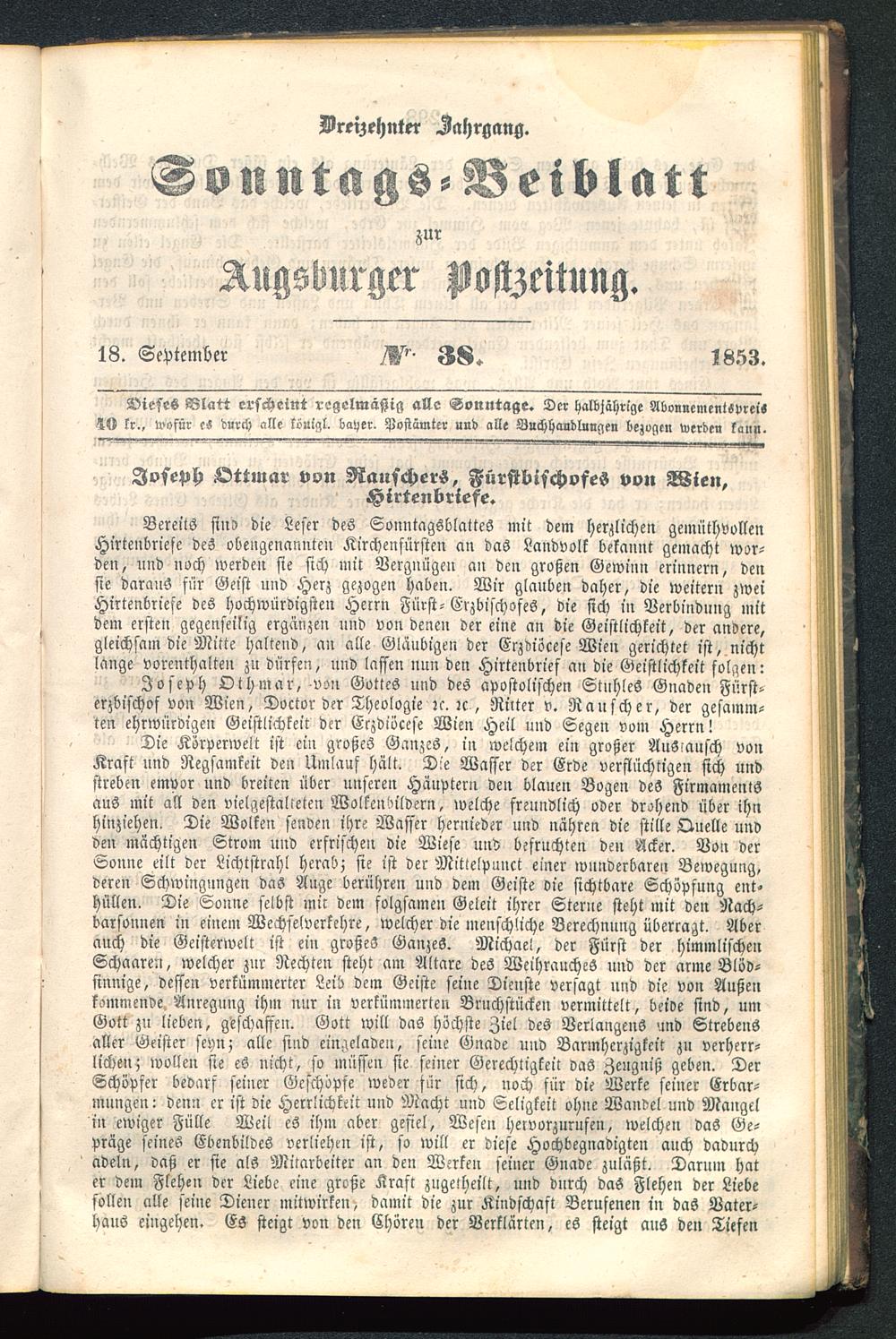 Bereits sins die Leser des SonntagsblatteS mit dem herzlicheil gemüthvollenHirtenbriefe deS obengenannten Kirchenfürsten an das Landvolk bekannt gemacht wor-den, und noch werden sie sich mit Vergnügen an den großen Gewinn erinnern, densie daraus für Geist und Herz gezogen haben. Wir glauben daher, die weitern zweiHirtenbriefe des hochwürdigsten Herrn Fürst-Erzbischofes, die sich in Verbindung mitdem ersten gegenseitig ergänzen und von denen der eine an die Geistlichkeit, der anvere,gleichsam die Mitte haltend, an alle Gläubigen der Erzdiocese Wien gerichtet ist, nichtlange vorenthalten zn dürfen, und lassen nun den Hirtenbrief an die Geistlichkeit folgen:
