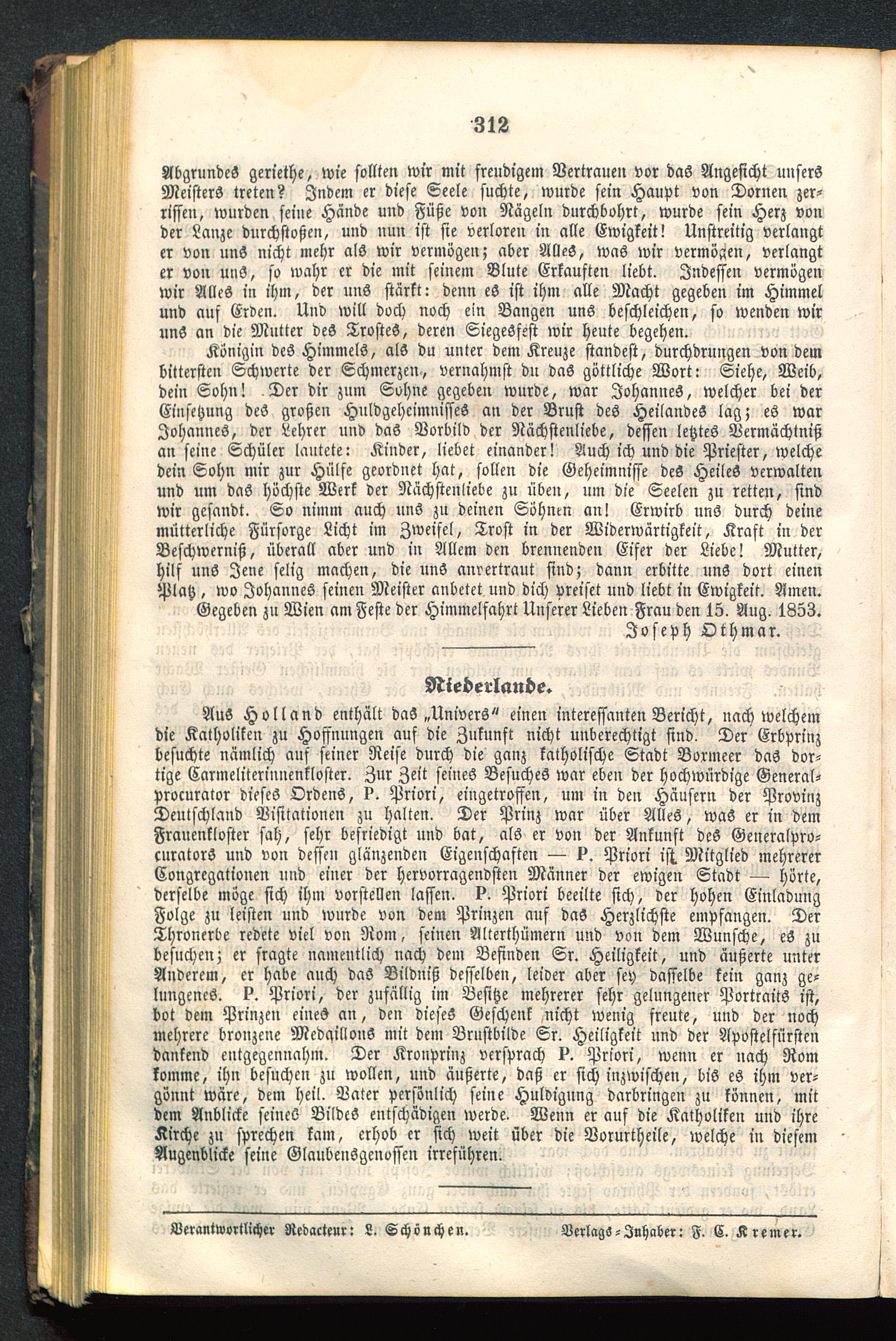 Königin des Himmels, als du unter dem Kreuze standest, durchdrungen von dembittersten Schwerte der Schmerzen, vernahmst du das göttliche Wort: Siehe, Weib,dein Sohn! Der dir zum Sohne gegeben wurde, war Johannes, welcher bei derEinsetzung des großen HuldgehcimnisseS an der Brust des Heilandes lag; es warJohannes, der Lehrer und das Vorbild der Nächstenliebe, dessen letztes Vermächtnißan seine Schüler lautete: Kinder, liebet einander! Auch ich und die Priester, welchedein Sohn mir zur Hülfe geordnet hat, sollen die Geheimnisse deS Heiles verwaltenund um das höchste Werk der Nächstenliebe zu üben, um die Seelen zu retten, sindwir gesandt. So nimm auch unS zu deinen Söhnen an! Erwirb uns durch deinemütterliche Fürsorge Licht im Zweifel, Trost in der Widerwärtigkeit, Kraft in derBeschwernis), überall aber und in Allem den brennenden Eifer der Liebe! Mutter,hilf uns Jene selig machen, die unS anvertraut sind; dann erbitte unS dort einenPlatz, wo Johannes seinen Meister anbetet und dich preiset und liebt in Ewigkeit. Amen.Gegeben zu Wien am Feste der Himmelfahrt Unserer Lieben Frau den 15. Aug. 1853.