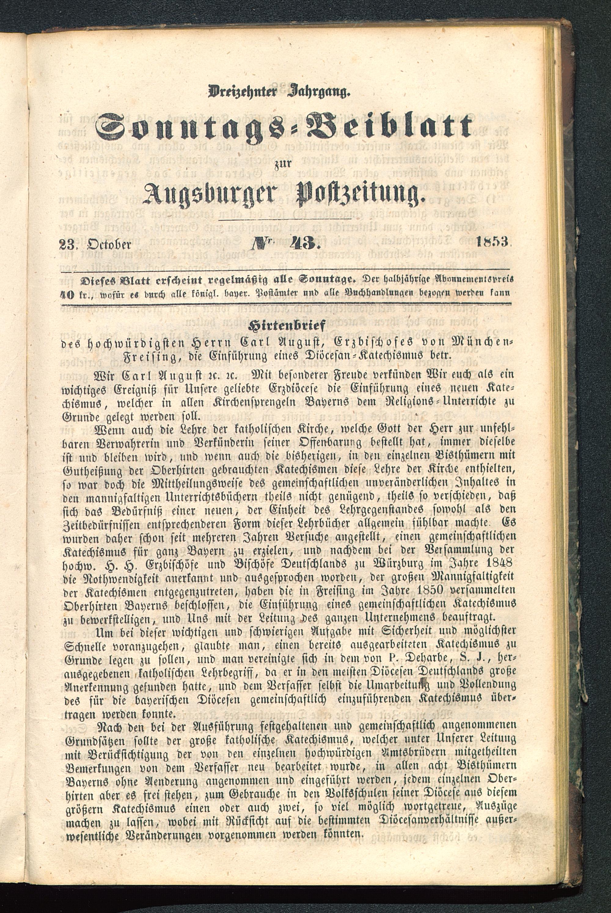 Wir Carl August :c. :c. Mit besmiderer Freude verkünden Wir euch als einwichtiges Ereigniß für Unsere geliebte Erzdiöcese die Einführung eines neuen Kate-chismus, welcher in allen Kirchensprengeln Bayerns dem Religions-Unterrichte zuGrunde gelegt werden soll.