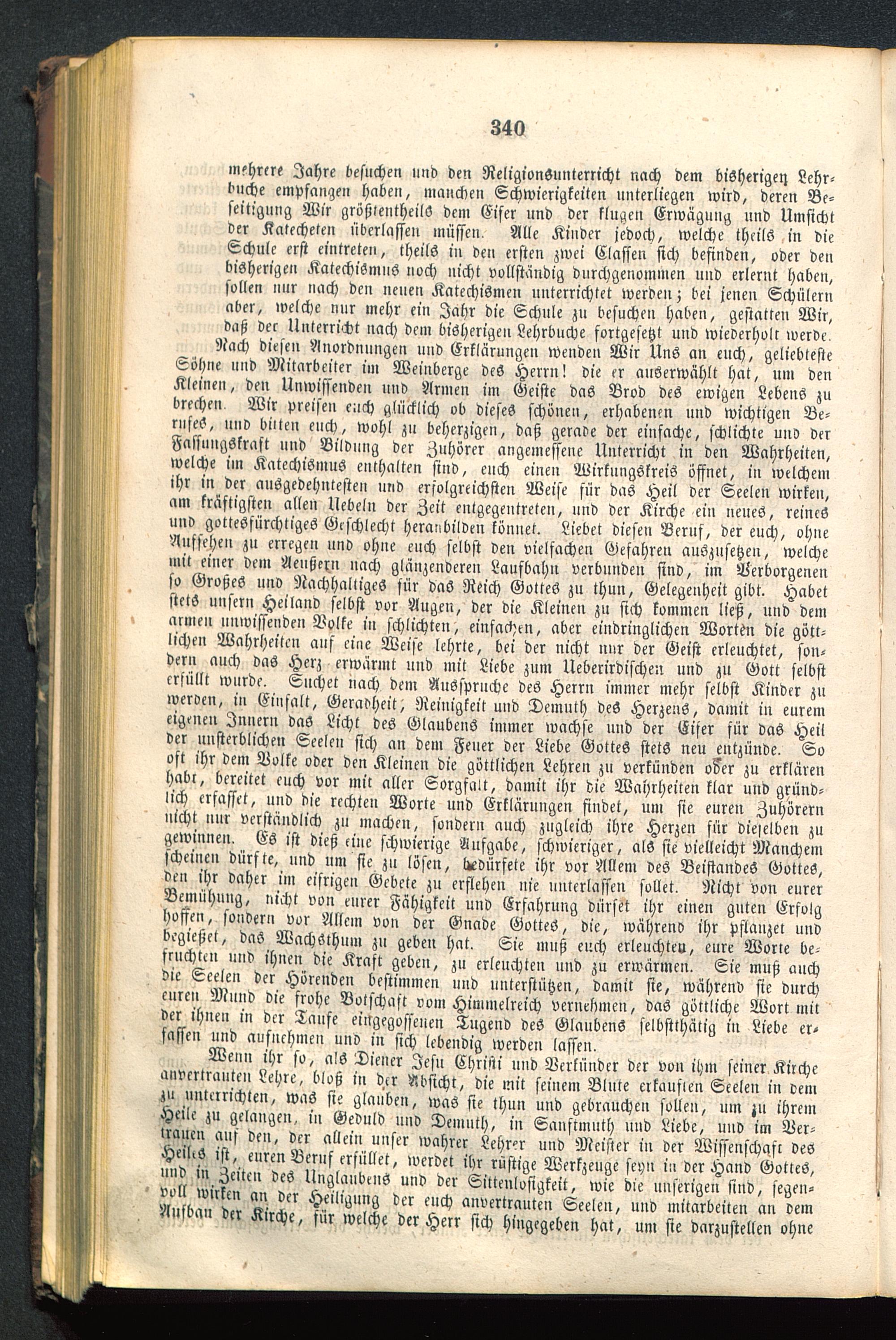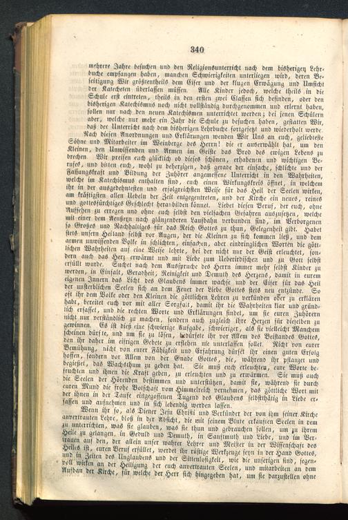 m-hrere Jahre besuchen und den ReligionSnnterricht nach dem bisherigen. Lehr-buche empfangen haben, manchen Schwierigkeiten unterliegen wird, deren Be-seitigung Wir größlentheilS dem Eiser und der klugen Erwägung und Umsichtder Katecheten überlassen müssen, Alle Kinder jedoch, welche theils in dieSchule erst eintreten, theils in den ersten zwei Classen sich befinden, oder denbisherigen Katechismus noch nicht vollständig durchgenommen und erlernt haben,sollen nur nach den nenen Katechismen unterrichtet werden; bei jenen Schillernaber, welche nur mehr ein Jahr die Schule zu besuchen haben, gestatten Wir,daß der Unterricht nach dem bisherigen Lehrbuche fortgesetzt und wiederholt werde.Nach diesen Anordnungen nnd Erklärungen wenden Wir Uns an euch, gelicbtesteSöhne und Mitarbeiter im Weinberge des Herrn! die er auöerwählt hat, um denKleinen, den Unwissenden nnd Armen im Geiste das Brod des ewigen Lebens zubreche» Wir preisen euch glücklich ob dieses schönen, erhabenen und wichtigen Be-rufes, und bitten euch, wohl zu beherzigen, daß gerade der einfache, schlichte uuv derFassungskraft und Bildung der Zuhörer angemessene Unterricht in den Wahrheiten,welche im Katechismus enthalten sind, euch einen Wirkungskreis öffnet, in welchemihr in der ausgedehntesten und erfolgreichsten Weise für das Heil der Seelen wirken,am kräftigsten allen Uebeln der Zeit entgegentreten, und der Kirche ein neues, reinesunv gotteSfürchtiges Geschlecht heranbilden könnet. Liebet diesen Berns, der euch, ohneAufsehen zu erregen und ohne euch selbst den vielfachen Gefahren auszusetzen, welchemit einer dem Aenßern nach glänzenderen Laufbahn verbunden sind, im Verborgenenso Großes unv Nachhalliges für daö Reich Gotteö zu thun, Gelegenheit gibt. Habetstets unsern Heiland selbst vor Augen, der die Kleinen zu sich kommen ließ, und demarmen unwissenden Volke i» schlichten, einfachen, aber eindringlichen Worten die gött-lichen Wahrheiten anf eine Weise lehrte, bei der nicht nur der Geist erleuchtet, son-dern anch das Herz erwärmt und mit Liebe zum Ueberirdischen und zu Gott selbsterfüllt wnrde. Suchet nach dem Ausspruche des Herrn immer mehr selbst Kinder zuwerden, in Einfalt, Geradheit, Reiuigkcit und Demuth deS Herzens, damit in euremeigenen Innern daö Licht des Glaubens immer wachse und der Eifer für das Heilder unsterblichen Seelen sich an dem Feuer der Liebe Gottes stets neu entzünde. Sooft ihr dem Volke oder den Kleinen die göttlichen Lehren zu verkünden o?er zu erklärenhabl, bereitet euch vor mit aller Sorgfall, damit ihr die Wahrheilen klar und gründ-lich erfasset, und die rechten Worte und Erklärungen findet, um sie euren Zuhörernnicht nur verständlich zu machen, sondern anch zugleich ihre Herzen für dieselben zugewinnen. Es ist dieß nnc schwierige Aufgabe, schwieriger, als sie vielleicht Manchemscheinen dürfte, und um sie zu lösen, lUdürfete ihr vor Allem des Beistandes Gottes,den ihr daher im eifrigen Gebete zu erflehen nie uulerlasseu sollet. Nicht von eurerBemühung, nicht von enrer Fähigkeit und Erfahrung dürfet ihr einen gnten Erfolghoffen, sondern vor Allem von der Gnade Gottes, die, während ihr Pflanzer undbegießet, daö Wachsthum zu geben hat. Sie muß euch erleuchte», eure Worie be-fruchten und ihnen die Kraft geben, zu erleuchten nnd zu erwärmen. Sie muß auchdie Seelen der Hörenden bestimmen und unterstützen, damit sie, während sie durcheuren Mund die frohe Botschaft vom Himmelreich verncluuen, das göttliche Wort mitder ihnen in der Taufe eiilgegossenen Tugend des Glaubens selbstthätig in Liebe er-sassen und aufnehmen und in sich lebendig werden lassen.