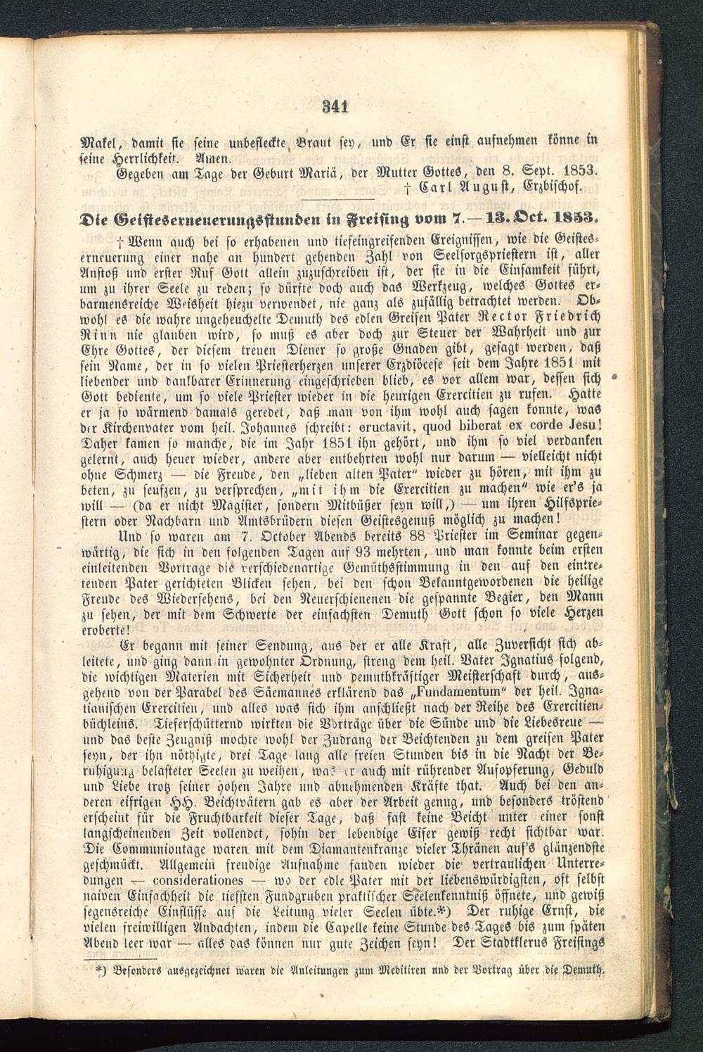 Besonders ausgezeichnet waren die Anleitungen zum Meditiren und der Aortrag über die Demuth.