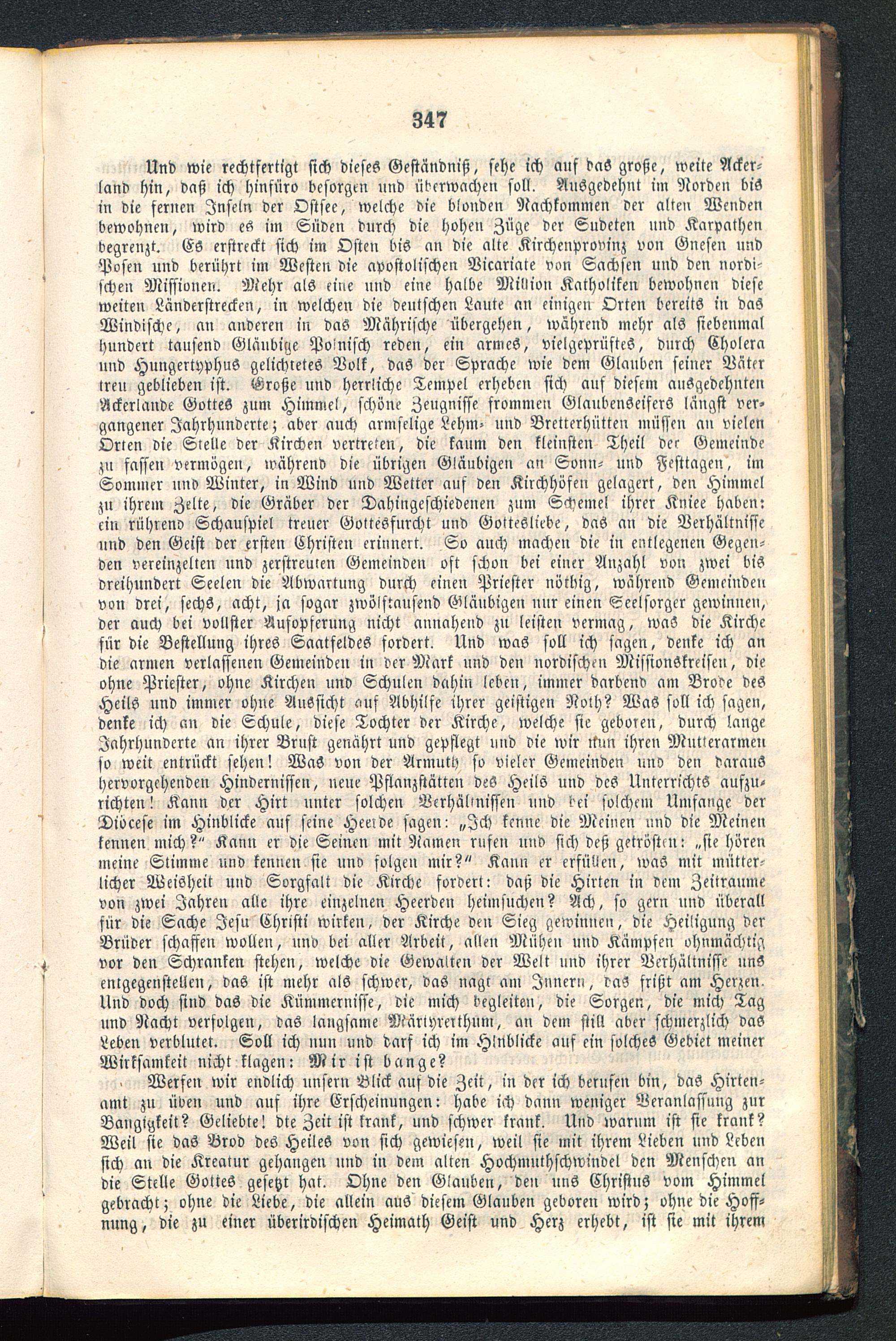 Und wie rechtfertigt sich dieses Geständniß, sehe ich auf das große, weite Acker-land hin, daß ich hinfüro besorgen und überwachen soll. Ausgedehnt im Norden bisin die fernen Inseln der Ostsee , welche die blonden Nachkommen der alten Wendenbewohnen, wird es im Enden durch die hohen Züge der Sudeten und Karpathenbegrenzt. Es erstreckt sich im Osten bis an die alte Kirchenprovinz von Gnesen undPosen und berührt im Westen die apostolischen Vicariate von Sachsen und den nordi-sehen Missionen. Mehr als eine und eine halbe Million Katholiken bewohnen dieseweiten Länderstrecken, in welchen die deutschen Laute an einigen Orten bereits in dasWindische, an anderen in das Mährische übergehen, während mehr als siebenmalhundert tausend Gläubige Polnisch reden, ein armeS, vielgeprüftes, durch Choleraund Hungertyphus gelichtetes Volk, das der Sprache wie dem Glauben seiner VäterIren geblieben ist. Große und herrliche Tempel erheben sich aus diesem ausgedehntenAckcrlande GotteS zum Himmel, schöne Zeugnisse frommen GlaubenSeiferS längst ver-gangener Jahrhunderte; aber auch armselige Lehm- und Bretterhütten müssen an vielenOrten die Stelle der Kirchen vertreten, die kaum den kleinsten Theil dce Gemeindezu fassen vermögen, während die übrigen Gläubigen an Sonn- und Festtage», imSommer und Winter, in Wind und Wetter auf den Kirchhöfen gelagert, den Himmelzn ihrem Zelte, die Gräber der Dahingeschiedenen znm Schemel ihrer Kniee haben:ein rühren» Schauspiel treuer Gottesfurcht und GotteSliebe, das an die Verhältnissennd den Geist der ersten Christen erinnert. So auch machen die in entlegenen Gegen-den vereinzelten und zerstreuten Gemeinden oft schon bei einer Anzahl von zwei bisdreihundert Seelen die Abwartnng durch einen Priester nötbig, während Gemeindenvon drei, sechs, acht, ja sogar zwölstauseud Gläubigen nur einen Seelsorger gewinnen,der auch bei vollster Aufopferung nicht annähend zu leisten vermag, was die Kirchefür die Bestellung ihres Saatfeldes fordert. Und was soll ich sagen, denke ich andie armen verlassenen Gemeinden in der Mark und den nordischen MissionSkrcisen, dieohne Priester, ohne Kirchen und Schulen dahin leben, immer darbend am Brode desHeils nnd immer ohne Aussicht auf Abhilfe ihrer geistigen Noth? Waö soll ich sagen,denke ich an die Schule, diese Tochter der Kirche, welche sie geboren, durch langeJahrhunderte an ihrer Brust genährt und gepflegt und die wir rtun ihren Mutlerarmenso weit entrückt sehen! WaS von der Armuth so vieler Gemeinden uns den daraushervorgehenden Hindernissen, neue Pflanzstätten deö Heils und dcS Unterrichts aufzu-richten! Kann der Hirt unter solchen Verhältnissen und l>ei solchem Umfange derDiöcese im Hinblicke auf seine Hceide sagen: „Ich kenne die Meinen und die Meinenkennen mich?" Kann er die Seinen mit Namen rufen nnd sich deß getröstm: „sie hörenmeine Stimme und kennen sie und folge» mir?" Kaun er erfüllen, was mit mütter-licher Weisheit und Sorgfalt die Kirche fordert: daß die Hirten in dem Zeitraumevon zwei Jahren alle ihre einzelnen Heerden heimsuchen? Ach, so gern nnd überallfür die Sache Jesu Christi wirken, der Kirche den Sieg gewinnen, die Heiligung derBrüder schaffen wollen, und bei aller Arbeit, allen Mühen und Kämpfen ohnmächtigvor den Schranken stehen, welche die Gewalten der Welt und ihrer Verhältnisse unsentgegenstellen, das ist mehr als schwer, das nagt am Innern, ras frißt am Herzen.Und doch sind das die Kümmernisse, die mich begleiten, die Sorgen, die mich Tagund Nacht verfolgen, ras langsame Märiyreithum, an dem stil! aber schmerzlich dasLeben verblutet. Soll ich nun und darf ich im Hinblicke ans ein solches Gebiet meinerWirksamkeit nicht klagen: Mir ist bange?