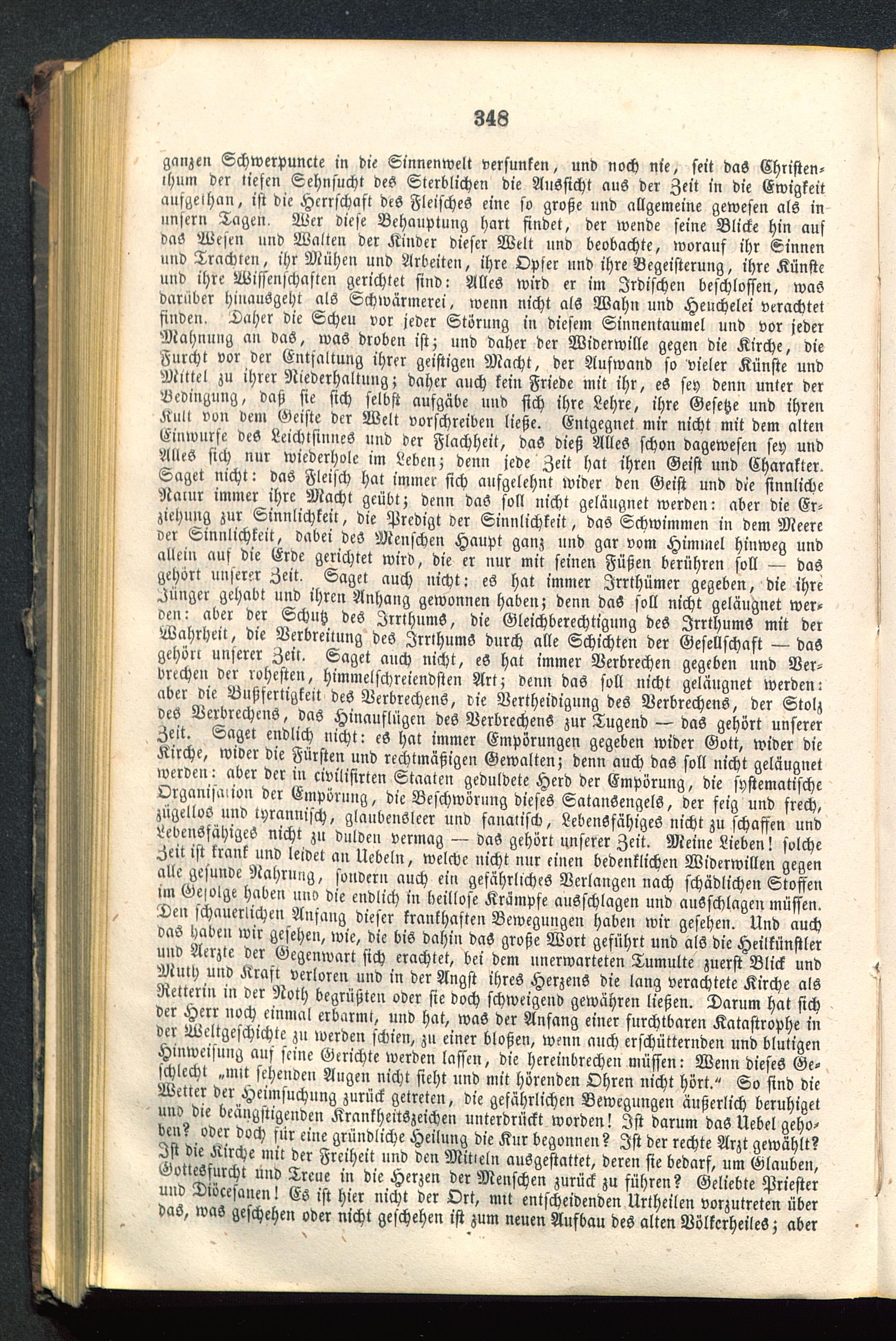 ganzen Schwerpuncte in die Sinnenwelt versunken, und noch nie, seit daS Christen-ihum der tiefen Sehnsucht des Sterblichen die Aussicht aus der Zeit in die Ewigkeitausgelhan, ist die Herrschaft deS Fleisches eine so große und allgemeine gewesen als inunsern Tagen, Wer diese Behauptung hart findet, der wende seine Blicke hin ausdas Wesen und Walten der Kinder dieser Welt und beobachte, worauf ihr Sinnenund Trachten, ihr Mühen und Arbeiten, ihre Opfer und ihre Begeisterung, ihre Künsteund ihre Wissenschaften gerichtet sind- Alles wird er im Irdischen beschlossen, wasdarüber hinausgeht als Schwärmerei, wenn nicht als Wahn und Heuchelei verachtetfinden. Daher die Scheu vor jeder Störung in diesem Sinnentaumel und vor jederMahnung an daS, was droben ist; und daher der Widerwille gegen die Kirche, dieFurcht vor der Entfaltung ihrer geistigen Macht, der Aufwand so vieler Künste undMittel zu ihrer Niederhaltung; daher auch kein Friede mit ihr, eS sey denn unter derBedingung, daß sie sich selbst aufgäbe und sich ihre Lehre, ihre Gesetze und ihrenKnll von dem Geiste der Welt vorschreiben ließe. Entgegnet mir nicht mit dem altenEinwürfe des Leichtsinnes und der Flachheit, daS dieß Alles schon dagewesen sey undAlles sich nur wiederhole im Leben; denn jede Zeit hat ihren Geist und Charakter.Saget nicht: das Fleisch hat immer sich aufgelehnt wider den Geist und die sinnlicheNaiur immer ihre Macht geübt; denn daö soll nicht gcläugnet werden: aber die Er-ziehung zur Sinnlichkeil, die Predigt der Sinnlichkeit, das Schwimmen in dem Meerever Sinnlichkeit, dabei des Menschen Haupt ganz und gar vom Himmel hinweg undallein auf die Erde gerichtet wird, die er nur mit seinen Füßen berühren soll — dasgehört unserer Zeit, Saget auch nicht: es hat immer Irrthümer gegeben, die ihrejünger gehabt und ihren Anhang gewonnen haben; denn daS soll nicht geläugnet wer-den: aber der Schutz des Irrthums, die Gleichberechtigung des Irrthums mit derWahrheit, die Verbreitung des Irrthums durch alle Schichten der Gesellschaft — daSgehörc unserer Zeit. Saget auch nicht, eS hat immer Verbrechen gegeben und Ver-brechen der rohesten, himmelschreiendsten Art; denn das soll nicht geläugnet werden:aber die Bußfertigkeit des Verbrechens, die Vertheidigung des Verbrechens, der Stolzdes Verbrechens, das Hinauflügcn des Verbrechens zur Tugend — daS gehört unsererZeit. Saget endlich nicht: eS hat immer Empörungen gegeben wider Gott , wider dieKirche, wiver die Fürsten und rechtmäßigen Gewalten; denn auch das soll nicht geläugnetwerben: aber der in civilisirten Staaten geduldete Herd der Empörung, die systematischeOrganisation der Empörung, die Beschwörung dieses SatanSengels, der feig und frech,zügellos und tyrannisch, glaubenölcer und fanaiisck, Lebensfähiges nicht zu schaffen undLebensfähiges nicht zu duldcu vermag — daS gehört unserer Zeit. Meine Lieben! solcheZeit ist krank und leidet an Uebeln, welche nicht nur einen bedenklichen Widerwillen gegenalle gesunde Nahrung, sondern auch ein gefährliches Verlangen nach schädlichen Stoffenim Ge>olge haben uns die endlich in beillose Krämpfe ausschlagen und auSschlagen müssen.Den schauerlichen Aufang dieser krankhaften Bewegungen haben wir gesehen. Und auchdaö haben wir gesehen, wie, die bis dahin daS große Wort geführt und als die Heilkünstlerund Aerzte der Gegenwart sich erachtet, bei dem unerwarteten Tumulte zuerst Blick undMuth und Kraft verloren und in der Angst ihres Herzens die lang verachtete Kirche alsRetterin in der Noth begrüßten oder sie doch schweigend gewähren ließen. Darum hat sichder Herr noch einmal erbarmt, uud hat, waS der Ansang einer furchtbaren Katastrophe inder Weltgeschichte zu werden schien, zu einer bloßen, wenn auch erschütternden und blutigenHinweisnng aus seine Gerichte werden lassen, die hereinbrechen müssen: Wenn dieses Ge-schlecht „mit sehenden Augen nicht sieht und mit hörenden Ohren nicht hört." So sind dieWetter der Heimsuchung zurück getreten, die gefährlichen Bewegungen äußerlich beruhigetuns die beäugstigenden KrankheitSzeichen unterdrückt worden! Ist darum das Uebel geho-ben? oder doch für eine gründliche Heilung die Kur begonnen? Ist der rechte Arzt gewählt?Ist die Kirche mit der Freiheit und den Mitieln ausgestattet, deren sie bedarf, um Glauben,Gottesfurcht und Treue in die Herzen der Menschen zurück zu führen? Geliebte Priesterund Diöcesanen I Es ist hier nicht der Ort, nnt entscheidenden Urtheilen vorzutreten überdaö, was geschehen oder nicht geschehen ist zum neuen Ausbau des alten VölkcrheileS; aber