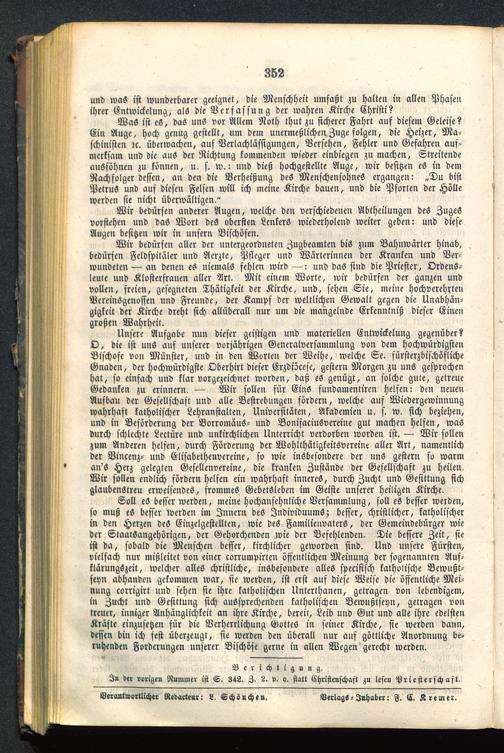 Soll eS besser werden, meine hochansehnliche Versammlung, soll es besser werden,so muß eS besser werden im Innern des Individuums; besser, christlicher, katholischerin den Herzen des Einzelgestellten, wie des Familienvaters, der Gemeindebürger wieder Staatsangehörigen, der Gehorchenden wie der Befehlenden. Die bessere Zeit, sieist da, sobald die Menschen besser, kirchlicher geworden sind. Und unsere Fürsten,vielfach nur mißleitet von einer corrumpirten öffentlichen Meinung der sogenannten Auf-klärungSzeit, welcher alles christliche, insbesondere alles specifisch katholische Bewußt-seyn abhanden gekommen war, sie werden, ist erst auf diese Weise die öffentliche Mei-nung corrigirt und sehen sie ihre katholischen Unterthanen, getragen von lebendigem,in Zucht und Gesittung sich aussprechenden katholischen Bewußtseyn, getragen vontreuer, inniger Anhänglichkeit an ihre Kirche, bereit, Leib und Gut und alle ihre edelstenKräfte einzusetzen für die Verherrlichung Gottes in seiner Kirche, sie werden dann,dessen bin ich fest überzeugt, sie werden den überall nur auf göttliche Anordnung be-ruhenden Forderungen unserer Bischöse gerne in allen Wegen gerecht werden.