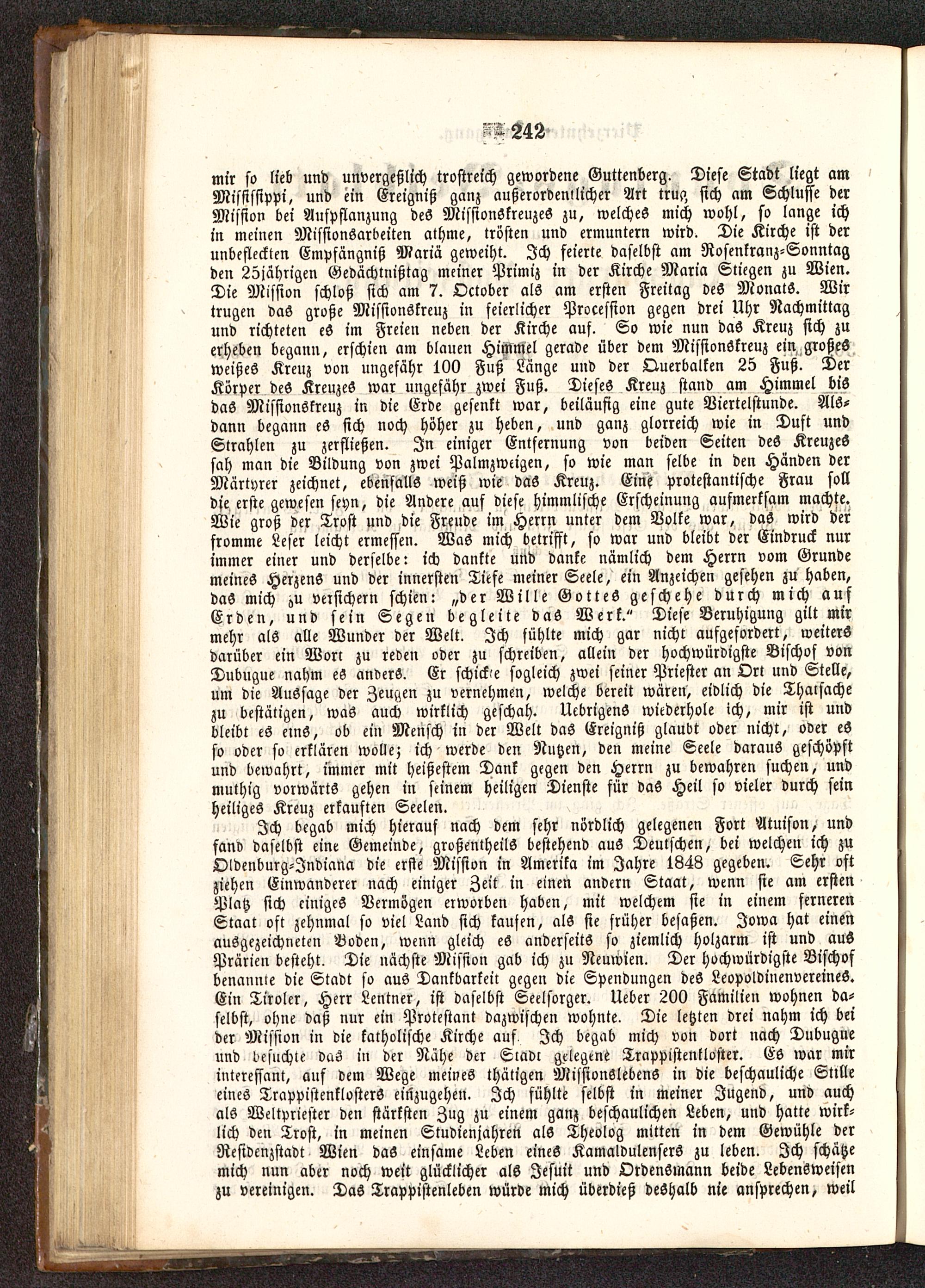 mir so lieb und unvergeßlich trostreich gewordene Guttenberg. Diese Stadt liegt amMississippi , und ein Ereigniß ganz außerordenilicher Art trug sich am Schlüsse derMission bei Aufpflanzung deS MisstonSkreuzeS zu, welches mich wohl, so lange ichin meinen Missionsarbeiten athme, trösten und ermuntern wird. Die Kirche ist derunbefleckten Empfängnis) Maria geweiht. Ich feierte daselbst am Rosenkranz -Sonntagden 35jährigen Gedächtnißtag meiner Primiz in der Kirche Maria Stiegen zu Wien .Die Mission schloß sich am 7. October als am ersten Freitag des MonatS . Wirtrugen das große Missionskreuz in feierlicher Procession gegen drei Uhr Nachmittagund richteten eS im Freien neben der Kirche auf. So wie nun das Kreuz sich zuerheben begann, erschien am blauen Himmel gerade über dem MissionSkreuz ein großesweißes Kreuz von ungefähr 1W Fuß Lange und der Querbalken 25 Fuß. DerKörper des Kreuzes war ungefähr zwei Fuß. Dieses Kreuz stand am Himmel bisdas MissionSkreuz in die Erde gesenkt war, beiläufig eine gute Viertelstunde. Als-dann begann eS sich noch höher zu heben, und ganz glorreich wie in Duft undStrahlen zu zerfließen. In einiger Entfernung von beiden Seiten deS KreuzeSsah man die Bildung von zwei Palmzweigen, so wie man selbe in den Händen derMärtyrer zeichnet, ebenfalls weiß wie das Kreuz. Eine protestantische Frau solldie erste gewesen seyn, die Andere auf diese himmlische Erscheinung aufmerksam machte.Wie groß der Trost und die Freude im Herrn unter dem Volke war, das wird derfromme Leser leicht ermessen. Was mich betrifft, so war und bleibt der Eindruck nurimmer einer und derselbe: ich dankte und danke nämlich dem Herrn vom Grundemeines Herzens und der innersten Tiefe meiner Seele, ein Anzeichen gesehen zu haben,das mich zu versichern schien: „der Wille GotteS geschehe durch mich ausErden, und sein Segen begleite das Werk." Diese Beruhigung gilt mirmehr als alle Wunder der Welt. Ich fühlte mich gar nicht aufgefordert, weiterSdarüber ein Won zu rede» oder zu schreiben, allein der hochwürdigste Bischof vonDubugue nahm es anders. Er schick-e sogleich zwei seiner Priester an Ort und Stelle,um die Aussage der Zeugen zu vernehmen, welche bereit wären, eidlich die Thalsachezu bestätigen, was auch wirklich geschah. UcbrigenS wiederhole ich, mir ist undbleibt es eins, ob ein Mensch in der Welt das Ereigniß glaubt oder nicht, oder eSso oder so erklären wolle; ich werde den Nutzen, den meine Seele daraus geschöpftund bewahrt, immer mit heißestem Dank gegen den Herrn zu bewahren suchen, undmuthig vorwärts gehen in seinem heiligen Dienste für das Heil so vieler durch seinheiliges Kreuz erkauften Seelen.